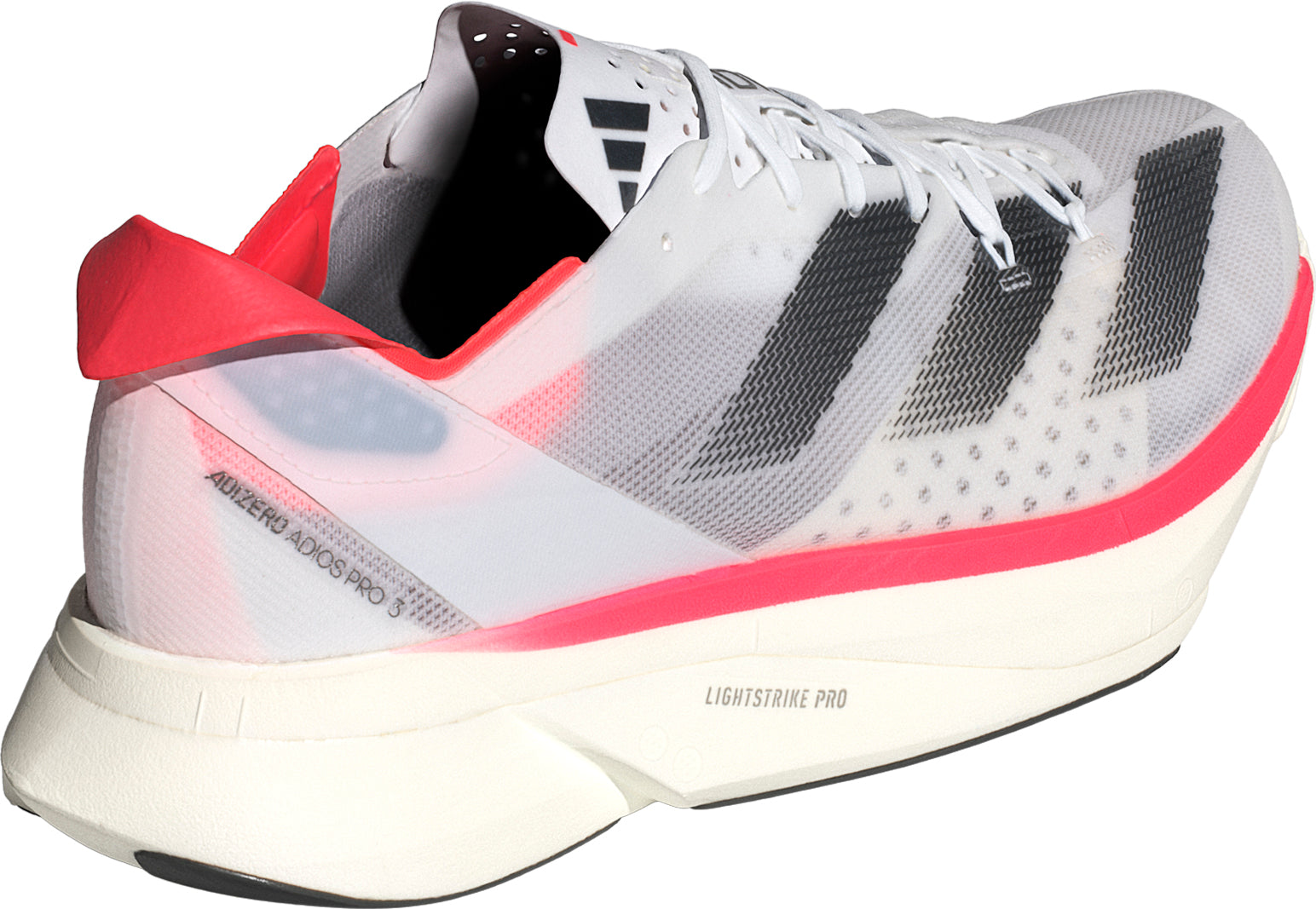 The Adizero Adios Pro 3 is the pinnacle of Adizero Racing products. It was built with and for athletes to achieve unbelievable feats. These adidas running shoes are made to optimize running efficiency. Our carbon-infused ENERGYRODS provide lightweight stiffness for a snappy, efficient stride. Ultralight LIGHTSTRIKE PRO cushions every step with two layers of our most resilient foam to help you maintain energy over the long term. It all rides on a thin layer of textile rubber outsole for extraordinary traction in wet and dry conditions.