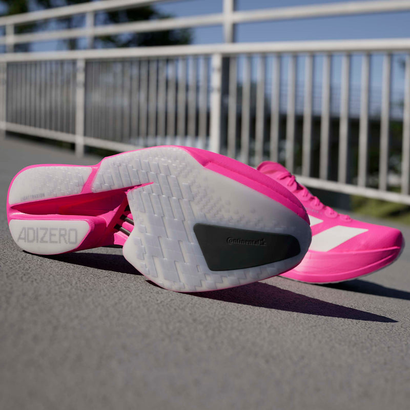Proven to be the world's most winning shoe, the Adizero Adios Pro line is the pinnacle of Adizero Racing shoes. The Adios Pro 4 is made for fast runners who want to experience faster, with enhanced features designed to optimize running efficiency. Our carbon-infused ENERGYRODS 2.0 provide a seamless transition from heel to toe for a snappy, efficient stride. In the midsole, a new rocker point offers improved running economy. A double layer of our best-in-class ultralight LIGHTSTRIKE PRO ensures cushioning for every quick stride you take, helping you maintain energy over the long term. The shoe rides on an outsole built with Continental™ rubber for a no-slip transition during toe-off, as well as LIGHTTRAXION, designed to reduce weight without sacrificing grip.