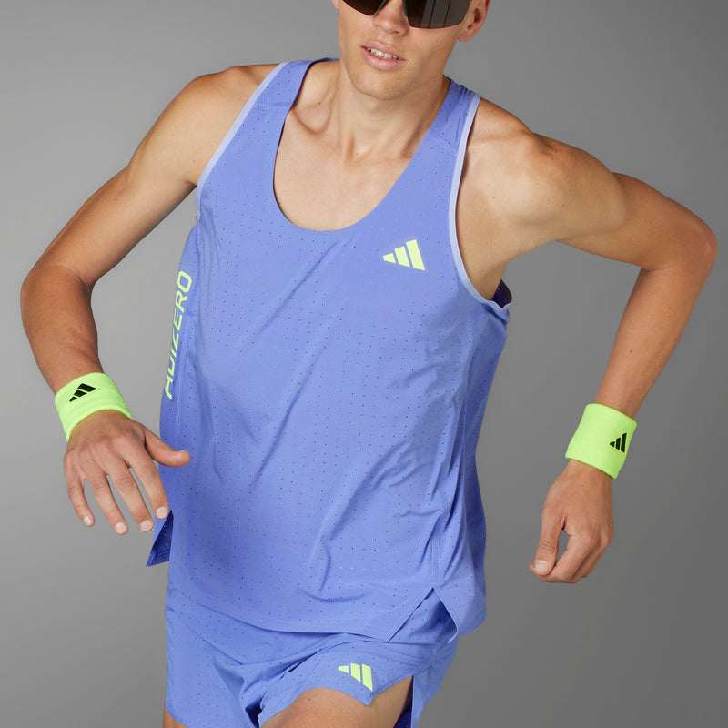 Push your limits in this adidas running singlet. The slim fit and perforated design ensure a lightweight, distraction-free feel on training runs and race day. When the finish is in sight and you pick up the pace, side slits give a full range of motion. AEROREADY technology wicks moisture to keep you dry for the duration, no matter how far or fast you go. This product is made with at least 70% recycled materials. By reusing materials that have already been created, we help to reduce waste and our reliance on finite resources and reduce the footprint of the products we make.