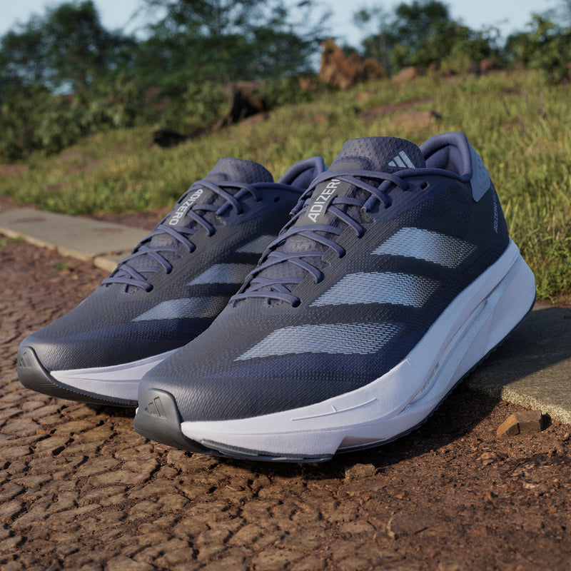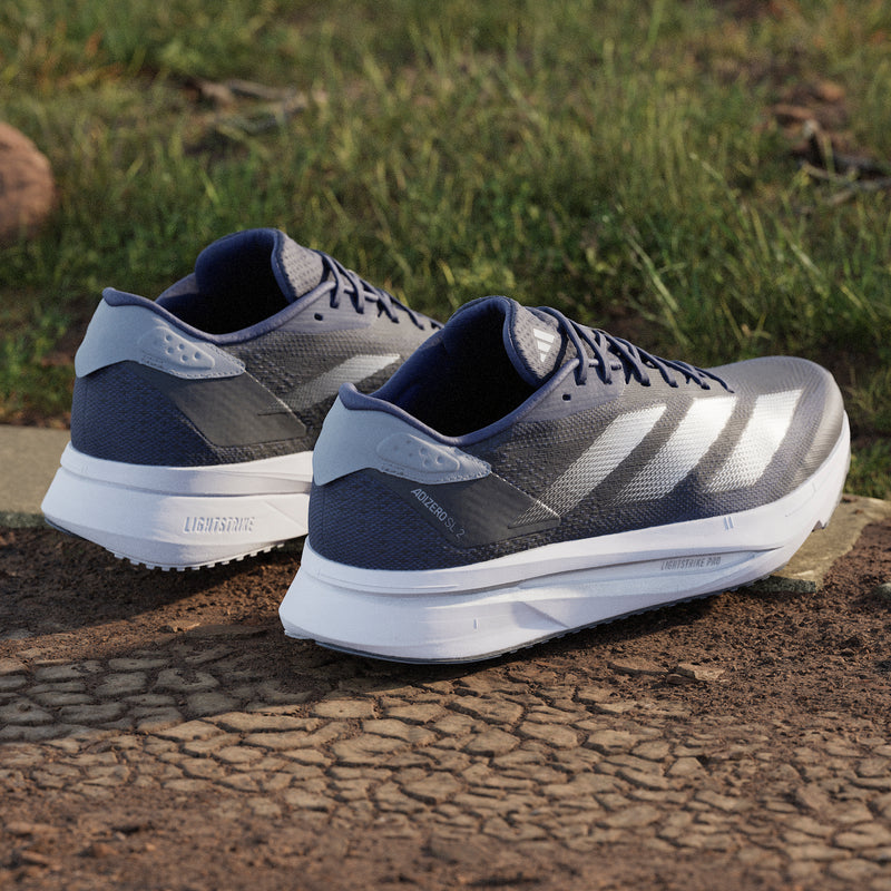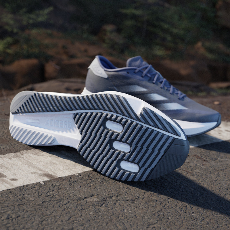Experience the thrill of breaking personal records in a shoe that's as fast as you are. These adidas Adizero running shoes are equipped with responsive Lightstrike Pro, super-light cushioning that delivers energy return for next-level speed. The engineered mesh upper provides breathability and targeted support where you need it most to keep you flying to the finish.