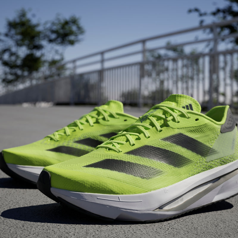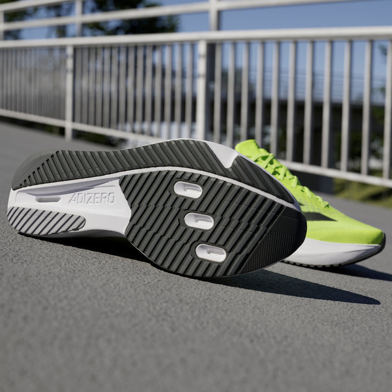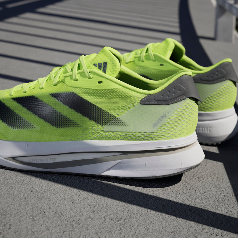 Experience the thrill of breaking personal records in a shoe that's as fast as you are. These adidas Adizero running shoes are equipped with responsive Lightstrike Pro, super-light cushioning that delivers energy return for next-level speed. The engineered mesh upper provides breathability and targeted support where you need it most to keep you flying to the finish.