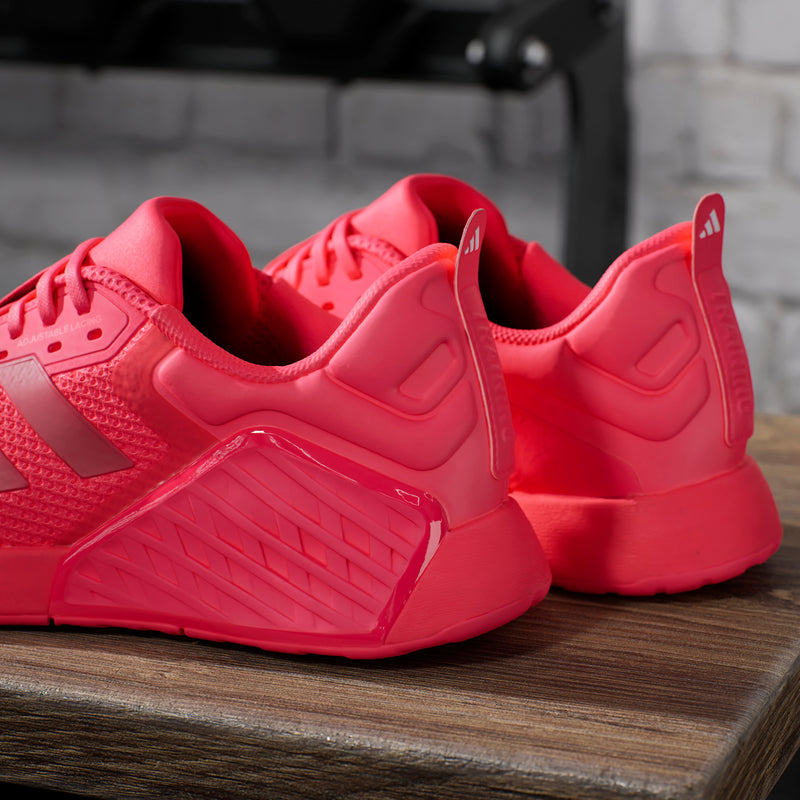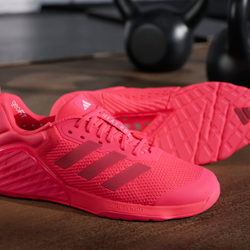 Whether lifting, pushing or pulling, Dropset 3 trainers provide the stable support needed for strength training. A dual-density midsole keeps feet cushioned through intense reps, while a TPU sidewall locks in the midfoot. adidas HEAT.RDY keeps feet cool even when the workout heats up. Wider than standard fit, these trainers comfortably contain any foot swell from exertion.
