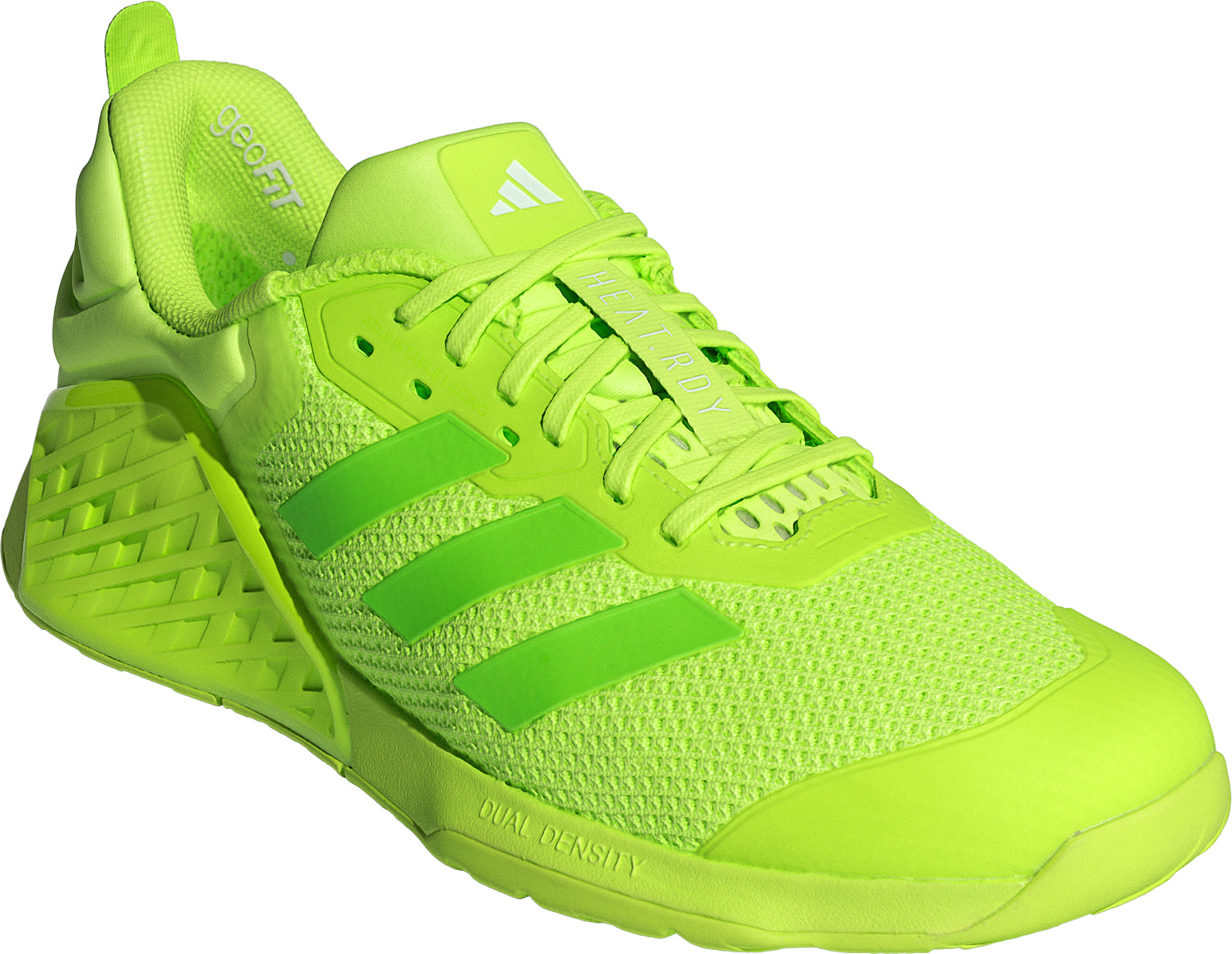Whether lifting, pushing or pulling, Dropset 3 trainers provide the stable support needed for strength training. A dual-density midsole keeps feet cushioned through intense reps, while a TPU sidewall locks in the midfoot. adidas HEAT.RDY keeps feet cool even when the workout heats up. Wider than standard fit, these trainers comfortably contain any foot swell from exertion.