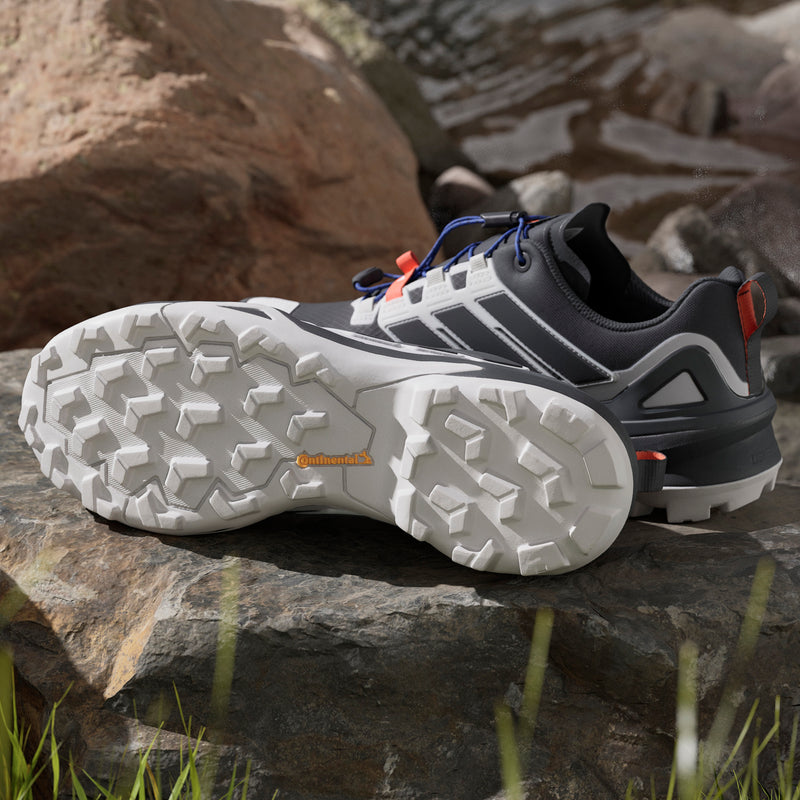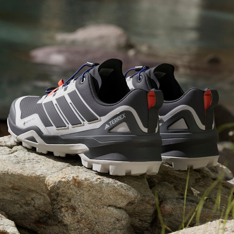 Designed for hikes and rugged summit scrambles, these adidas Terrex Skychaser hiking shoes balance protection, control and comfort for moving fast on and off the trail. They combine the agile, responsive feel of trail running shoes with the support and durability of hiking shoes. Step-in comfort and a lightweight feel keep you focused on the trail ahead. A waterproof GORE-TEX EPE membrane seals out wet conditions while letting your feet breathe and regulate temperature. A ripstop upper with abrasion-resistant overlays keeps them light and durable. The all-conditions grip of Continental™ Rubber maintains traction across all surfaces, wet or dry. The ultralight Lightstrike cushioning allows for responsive feel and agile footwork.