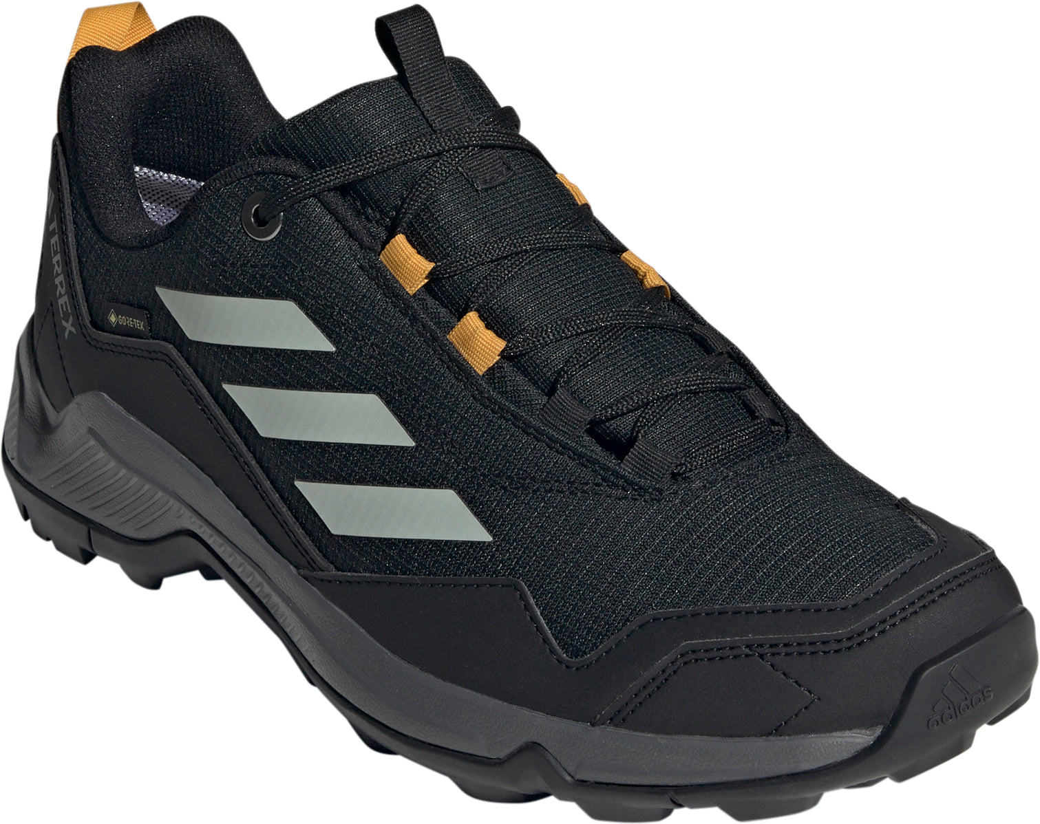 From muddy mountain trails to soggy forest floors, explore anywhere in the waterproof protection of these adidas hiking shoes. GORE-TEX repels water while also letting your feet breathe. The lightweight feel of EVA cushioning is paired with super-high-traction rubber, so you can walk with confidence on any trail.
