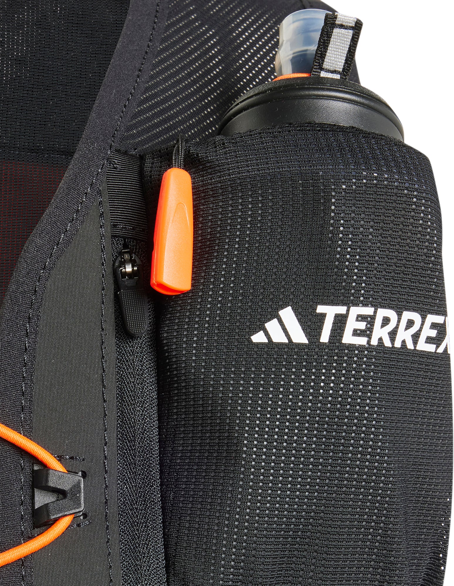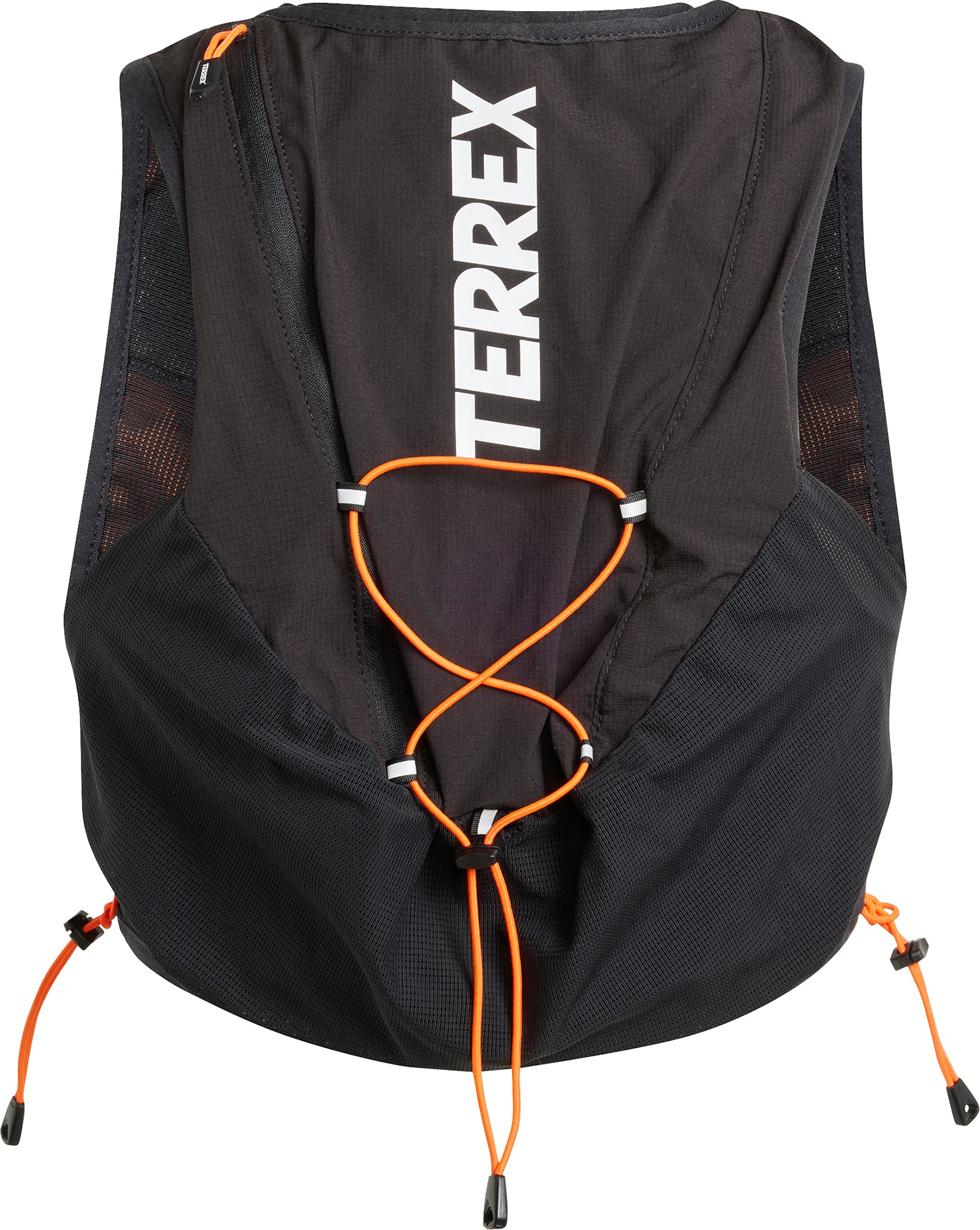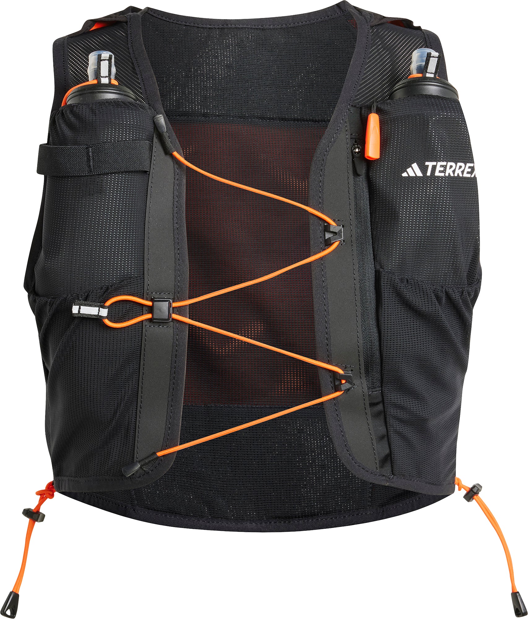 Extend your range on the trails with this adidas Terrex trail running vest. A 12-litre storage capacity lets you pack a shell or layer and essential extras for long days on the trail. The ultra-lightweight, breathable design features a bungee cinch for a secure, body-hugging fit. Multiple pockets, including a slip-in water bladder pocket, pole carry straps and several pockets for smaller essentials, set you up for extended efforts. Includes two water bottles.This product is made with at least 50% recycled materials. By reusing materials that have already been created, we help to reduce waste and our reliance on finite resources and reduce the footprint of the products we make.