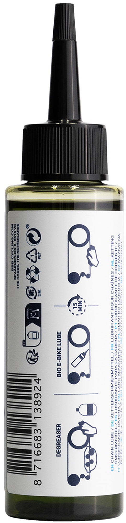BioEbikeLube chain lube is a chain lubricant made with 100% biodegradable and plant-based ingredients. It is a thick lube that is developed for optimal pressure resistance for high-torque E-bike chains. BioEbikeLube reduces friction and offers long-lasting protection against corrosion on your E-bike chain. As a result, the chain attracts less dirt, rotates smoothly, and wears less quickly. It is suitable for all weather types and has an excellent effect under cold and wet conditions.