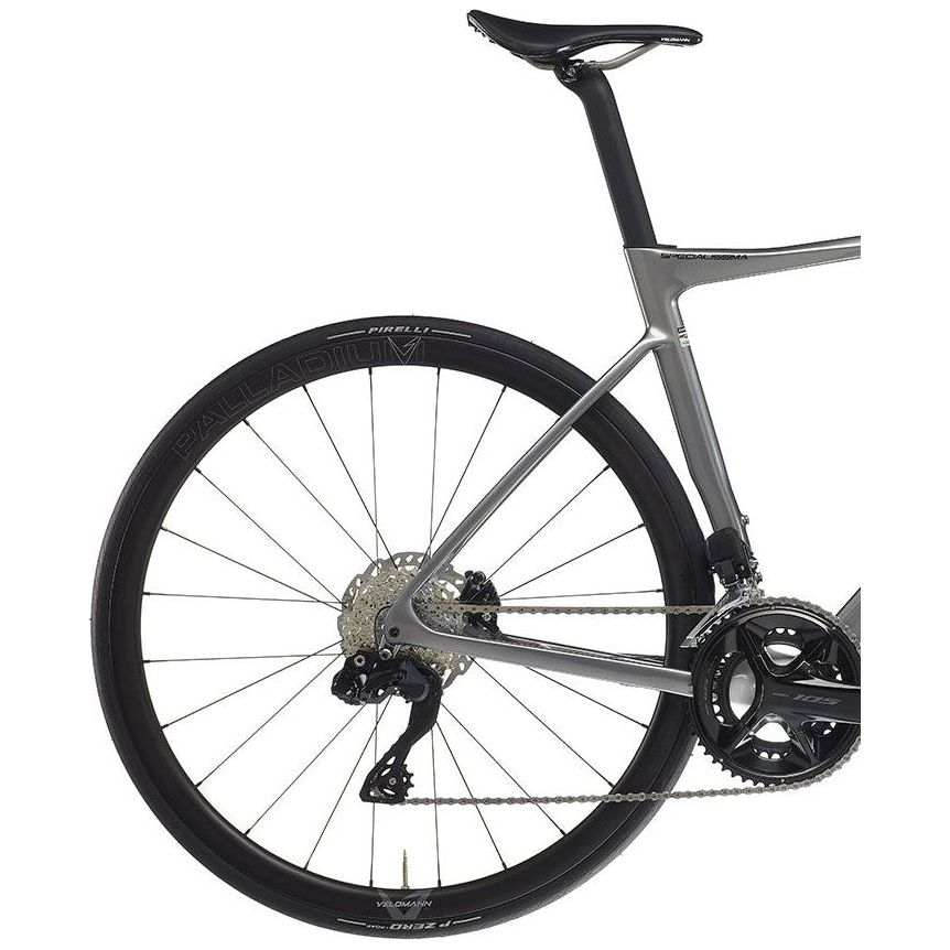 The Specialissima Pro is completed with Velomann Palladium wheels and a Velomann Mitora Hyper 139 mm saddle. It is available in two sophisticated matt color variants: Metallic Celeste with carbon black accents and Mystic Grey with carbon black accents.