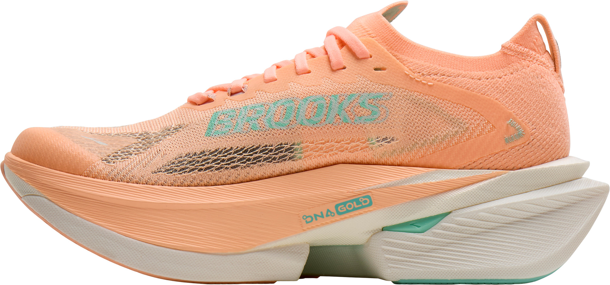 DNA GOLD 100% PEBA cushioning is the lightest, softest, and highest energy-return foam Brooks has ever made. A high-stack combination of DNA GOLD and DNA FLASH v2 cushioning, paired with the SpeedVault plate helps create game-changing protection, propulsion, and recovery.