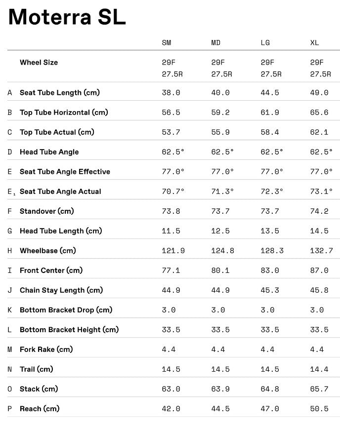| Frame | Moterra SL, Series 1 Carbon construction, 150mm travel, Proportional Response Tuned Suspension, FlexPivot Chainstay, direct mount internal battery, engineered plastic skid plate, 55mm chainline, DirectLine internal cable routing, 29” FlipChip, 148x12mm Maxle thru-axle, UDH hanger, 200mm native post mount brake, 1-1/8” – 1.5” tapered headtube, angle adjust headset |
