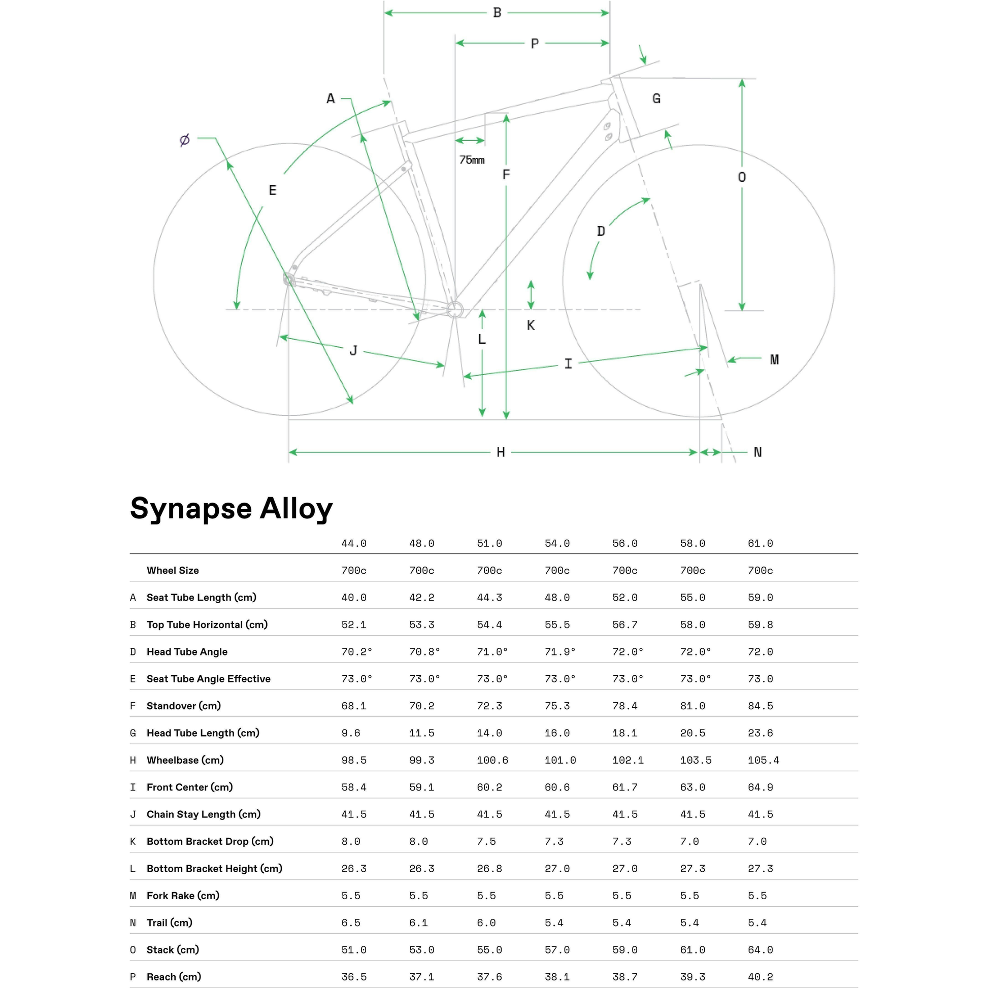 Synapse Alloy moves with both pace and grace. A comfortable riding position, planted handling, and the wonderful responsiveness of alloy under power, all create a bike that will help you feel in control and get more out of every ride.
