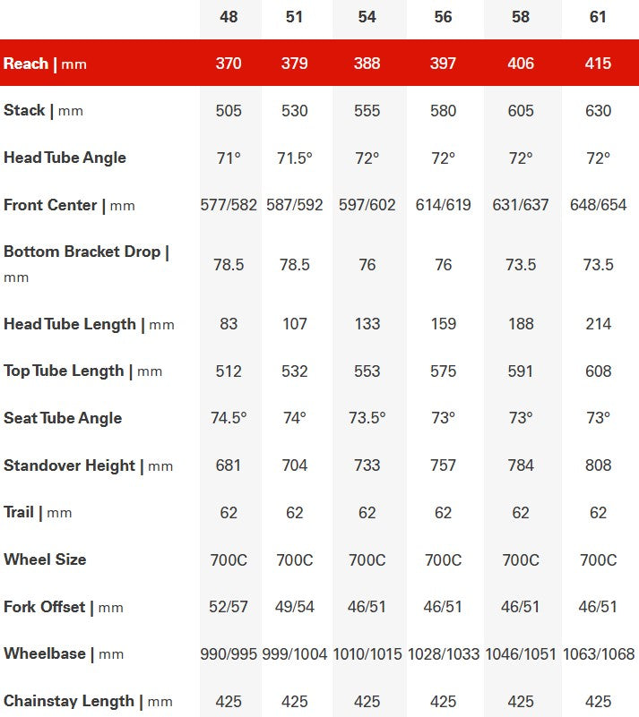 | Stem | Cervélo ST36 Alloy: Size 48 - 80mm Size 51 - 80mm Size 54 - 90mm Size 56 - 90mm Size 58 - 100mm Size 61 - 100mm |