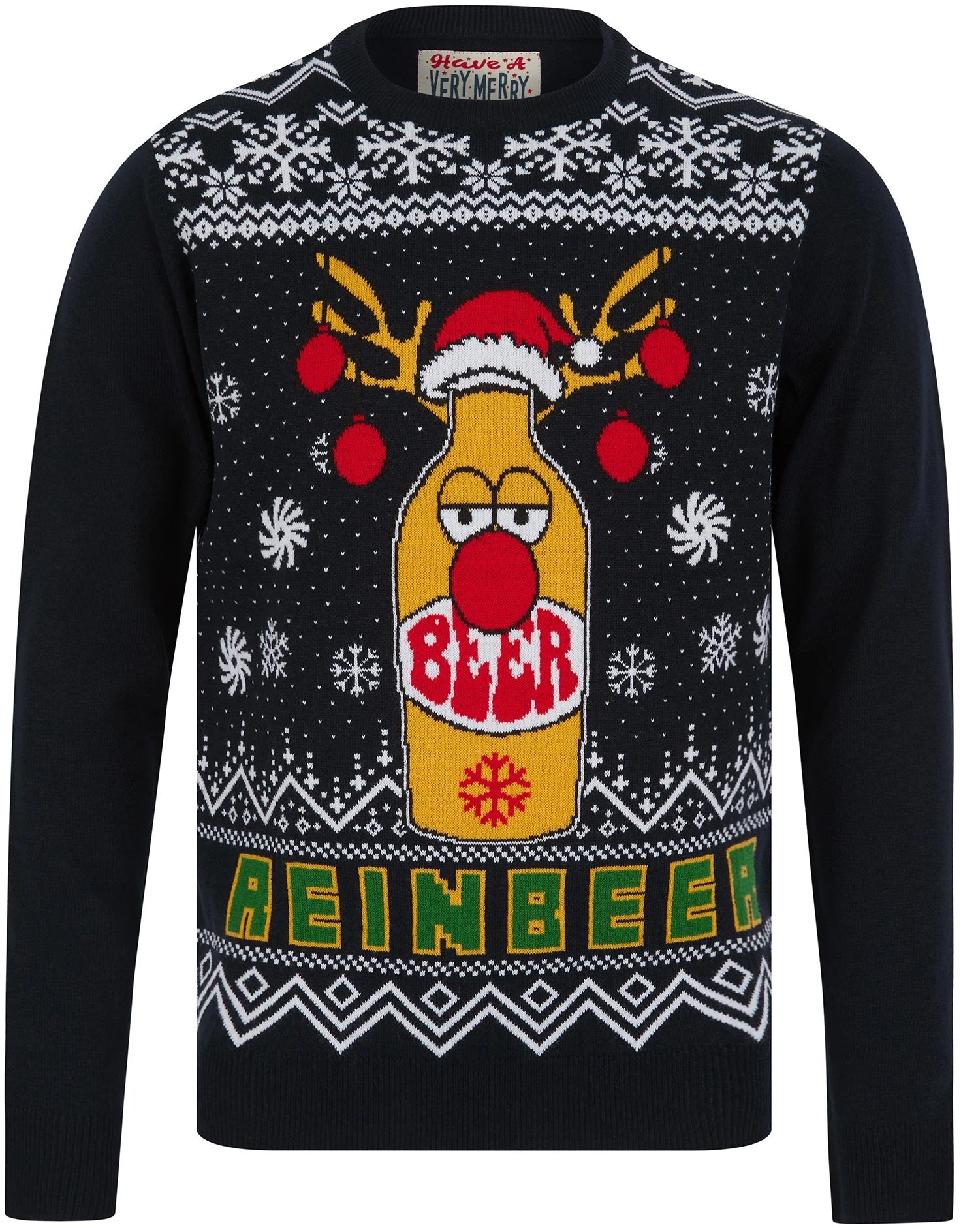 Featuring the humorous slogan ""Reinbeer,"" this jumper is ideal for social gatherings, pub nights, and family get-togethers, capturing the spirit of the season in a light-hearted, relatable way. Made from a soft-touch acrylic knit jacquard, it offers a comfortable stretch, and its classic crew neckline, long sleeves, and ribbed cuffs and hemline create a polished yet relaxed fit.