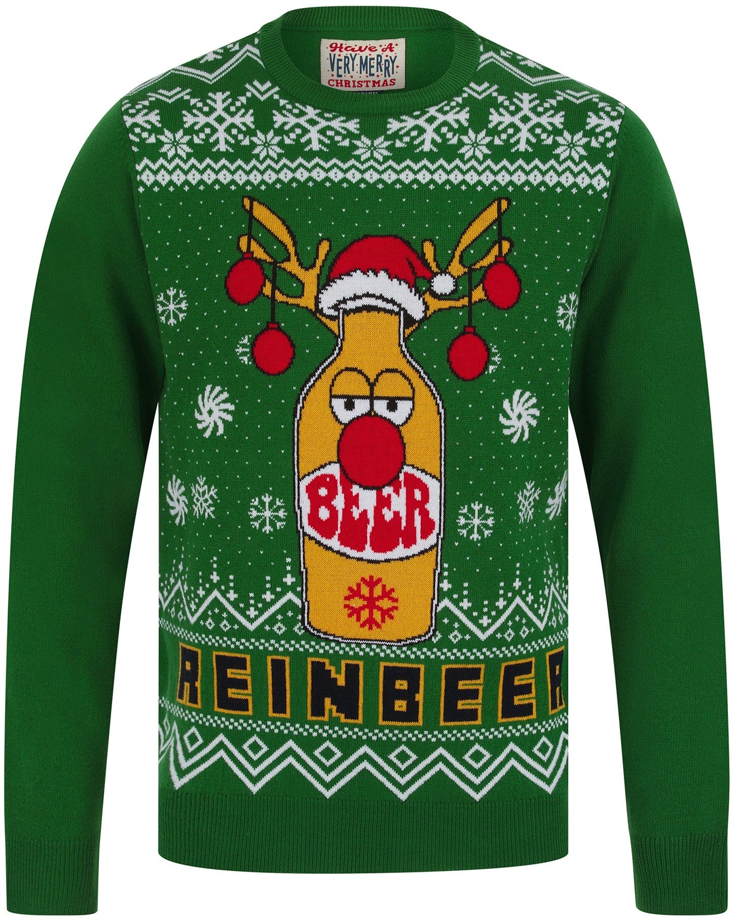 Featuring the humorous slogan ""Reinbeer,"" this jumper is ideal for social gatherings, pub nights, and family get-togethers, capturing the spirit of the season in a light-hearted, relatable way. Made from a soft-touch acrylic knit jacquard, it offers a comfortable stretch, and its classic crew neckline, long sleeves, and ribbed cuffs and hemline create a polished yet relaxed fit.