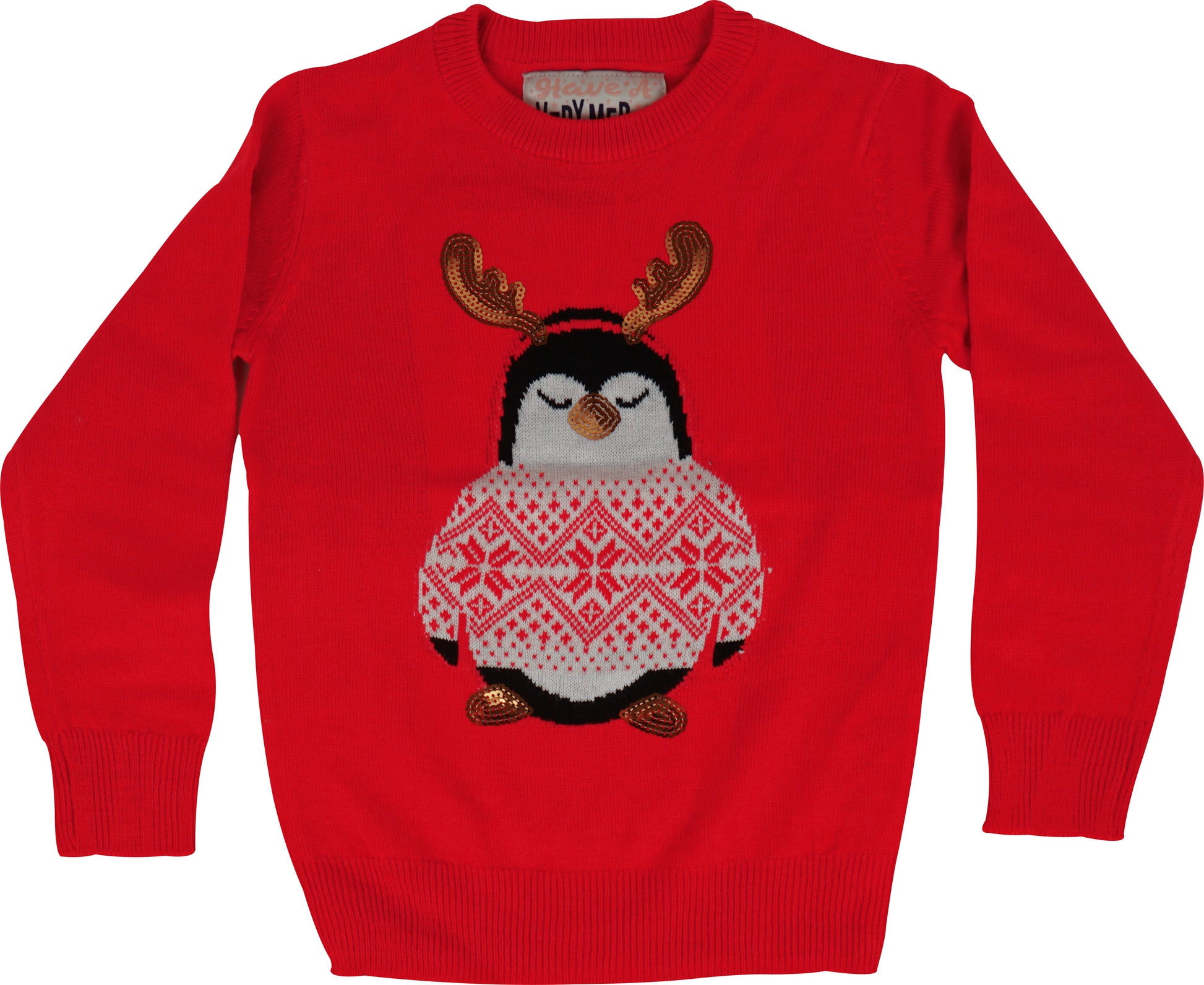Help her spread some festive joy with this super sweet Junior Cutie Penguin Christmas jumper This must have sweater is made in a soft acrylic knit construction to ensures a warm and cosy feel and fit. It features a cheerful penguin with gold sequinned antlers for an extra special touch. The jumper is styled with crew neck line, full length sleeves and ribbed cuffs & hemline. All you need is a tutu or leggings to match!