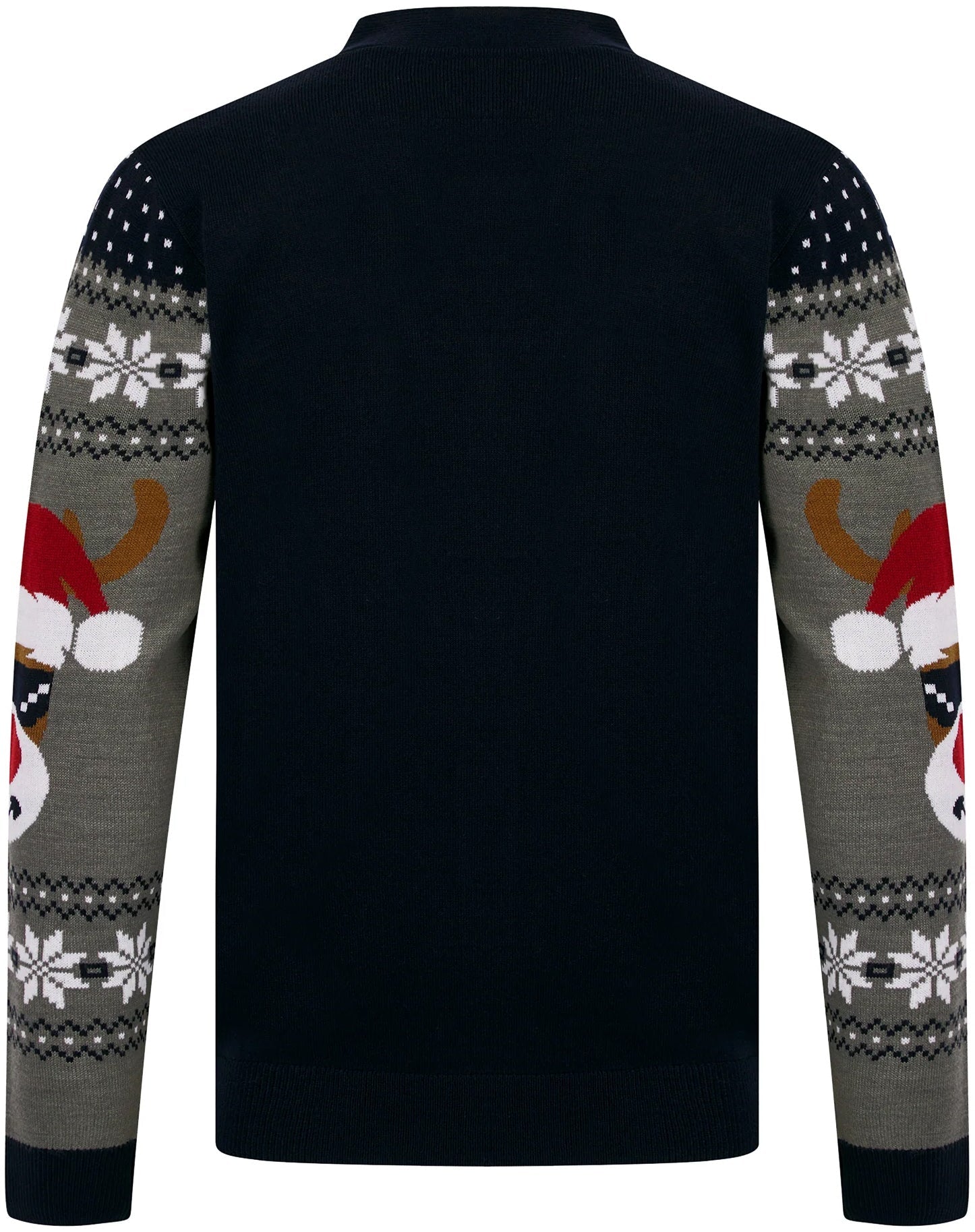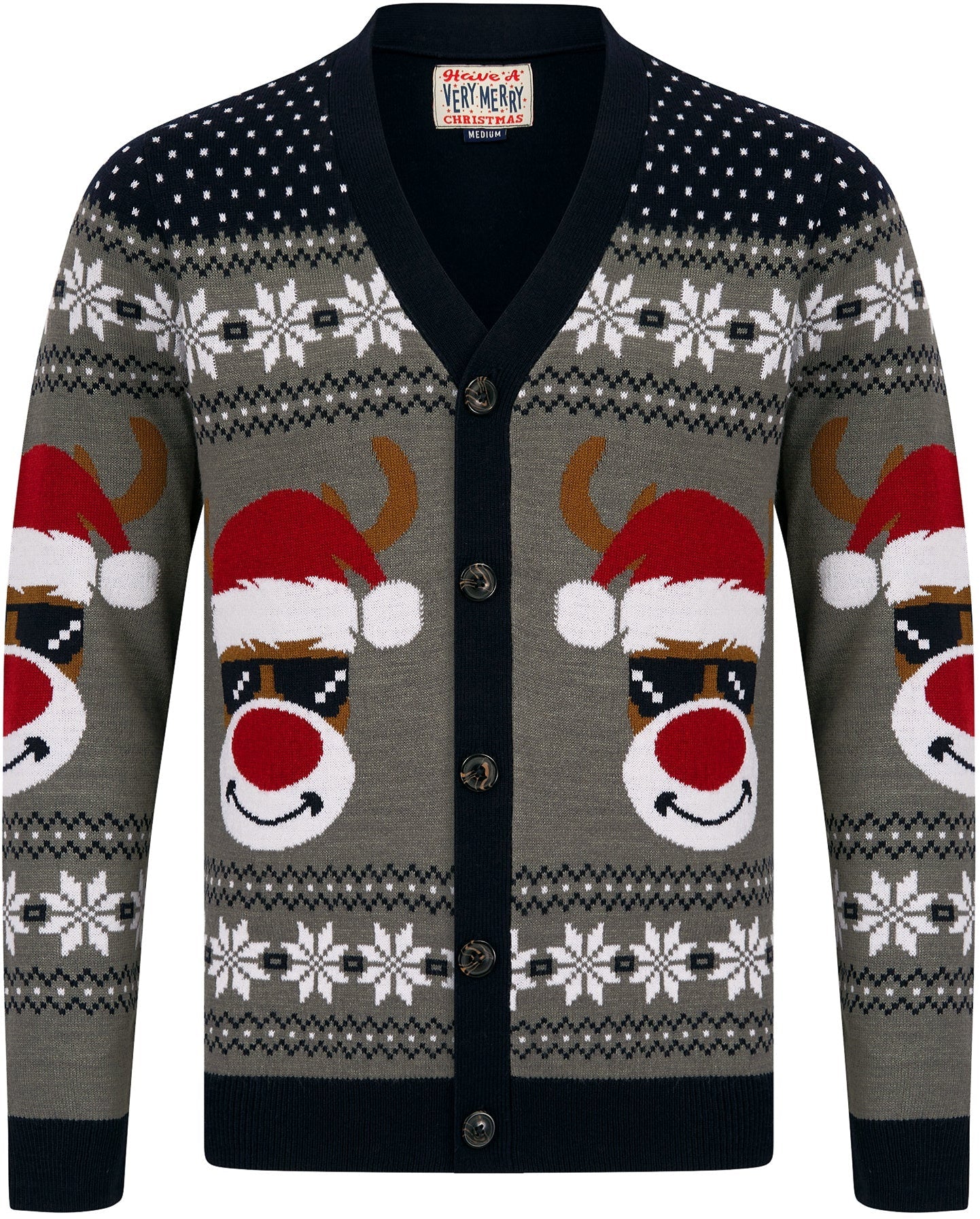 Embrace the holiday spirit with the lively 'Deer Smile' Jacquard Knit Novelty Christmas Cardigan in Ink by Merry Christmas. Designed to make you stand out, this cardigan adds a cheerful touch to your festive wardrobe, featuring a charming smiling deer motif along with a Nordic-inspired snowflake pattern that captures the joy of the season.