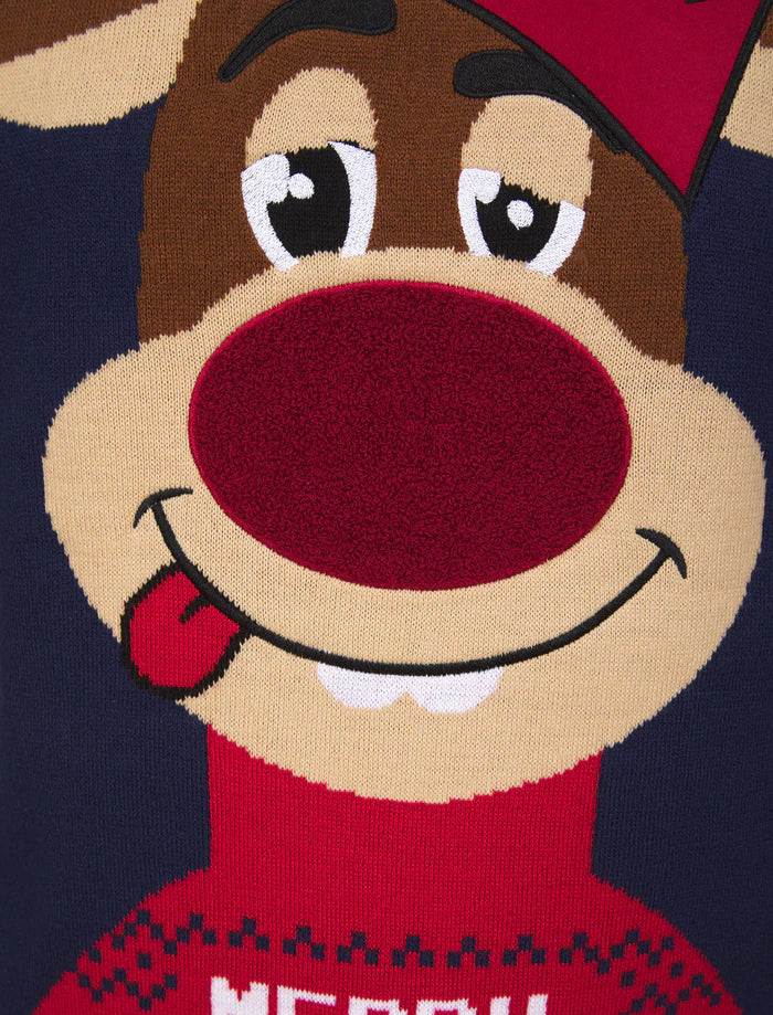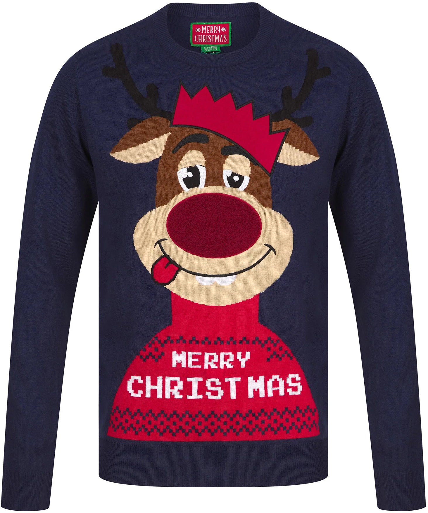 Light up the party with this fantastic men’s ‘Feelin Merry’ motif LED light up novelty Christmas jumper in french navy by Merry Christmas. This fun and festive novelty pullover features an obviously 'refreshed' and merry Reindeer motif to the front! Embellishments include a jaunty applique party hat, a boucle textured applique red nose and 'Merry Christmas' slogan on his jumper. It features motion sensor LED lights embedded into the jumper to truly give you that wow factor. Crafted in soft touch acrylic knit jacquard construction to ensure a soft and comfortable fit, it has a ribbed crew neckline, cuffs and hem to finish. Simply pair with your favourite style bottom – whether that’s jeans or joggers!