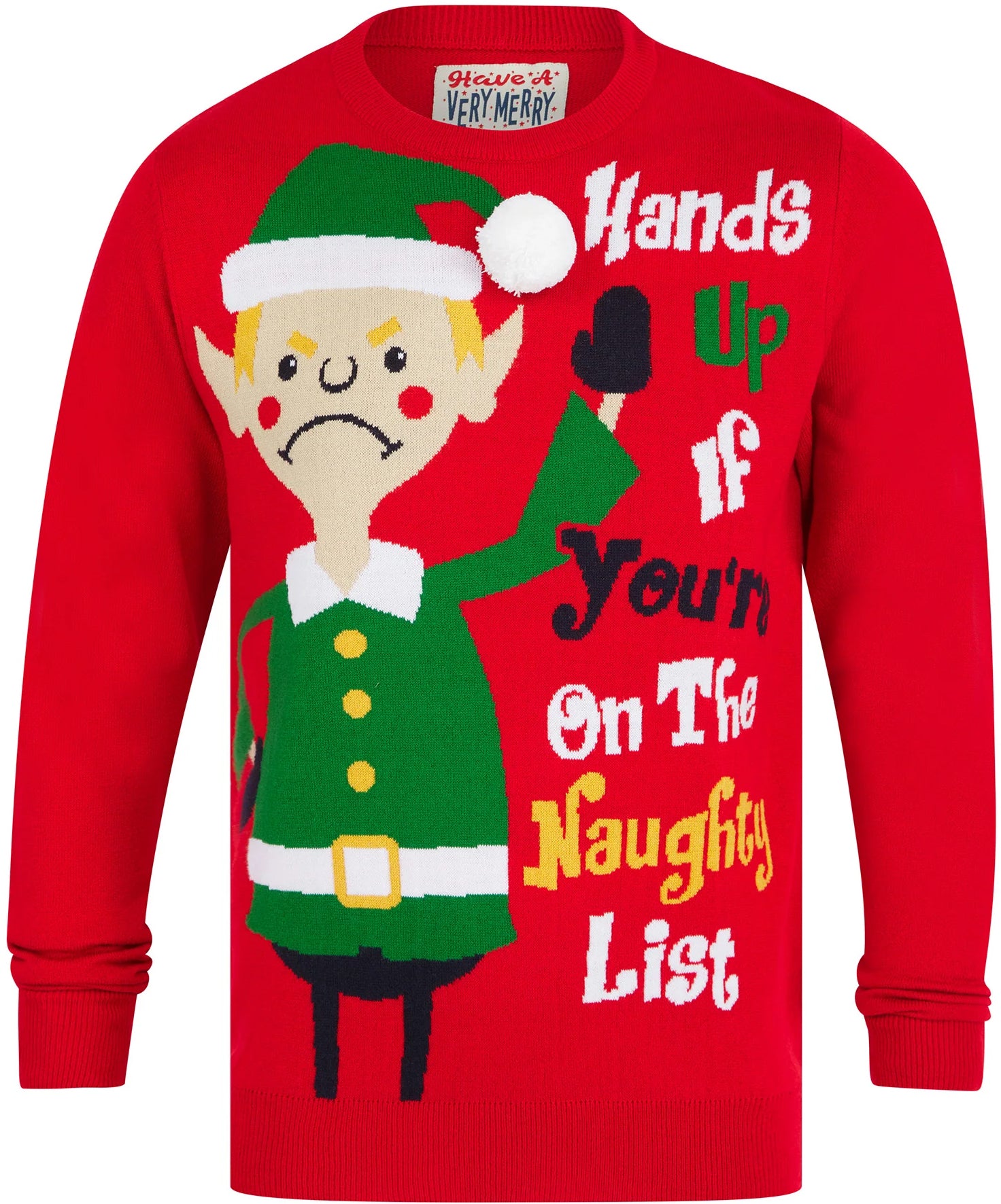 Front and centre, a mischievous elf takes the stage alongside the hilarious slogan, ""Hands Up If You're On The Naughty List!"" It's not just a jumper; it's an embodiment of holiday spirit and contagious merriment.