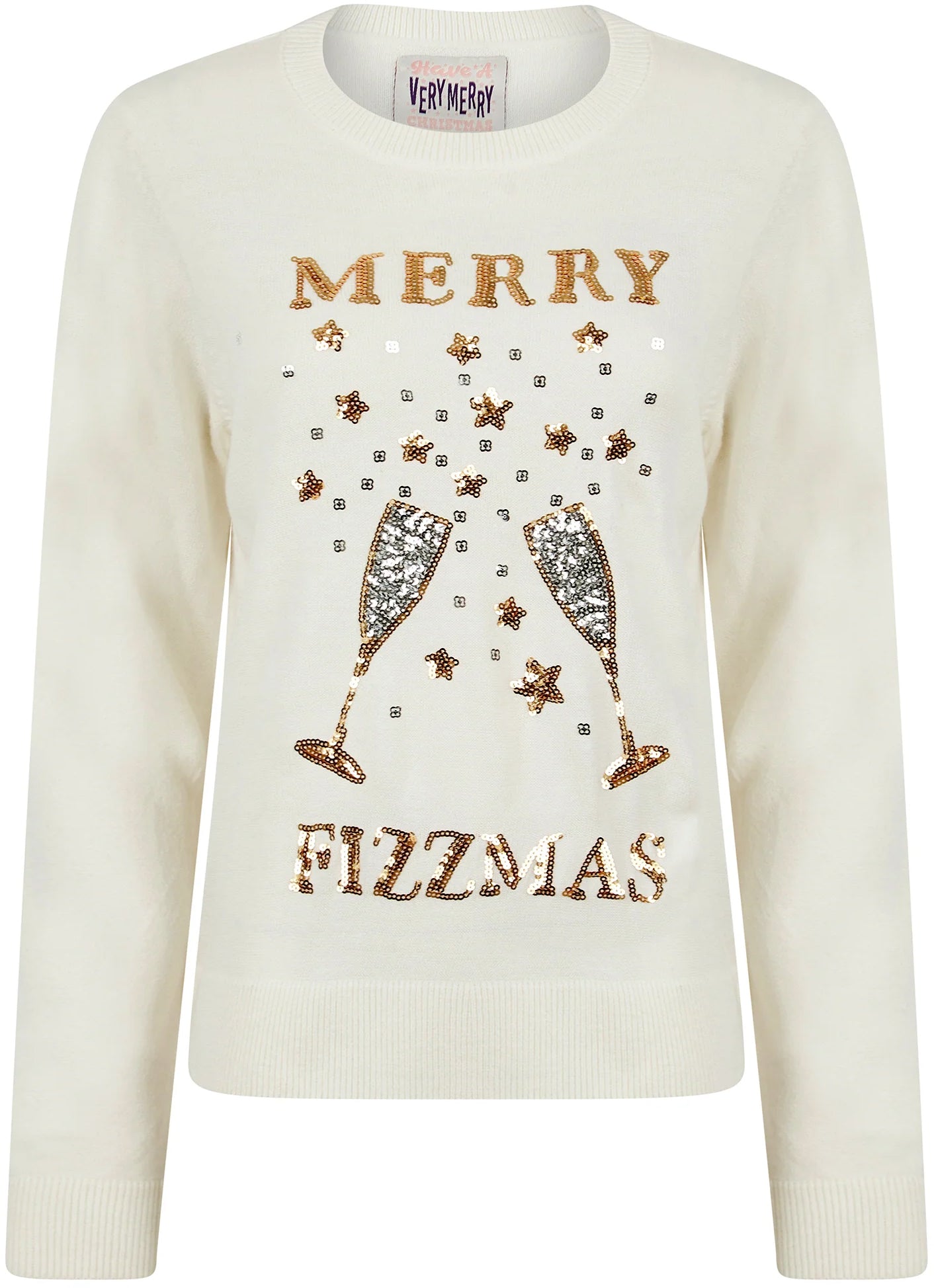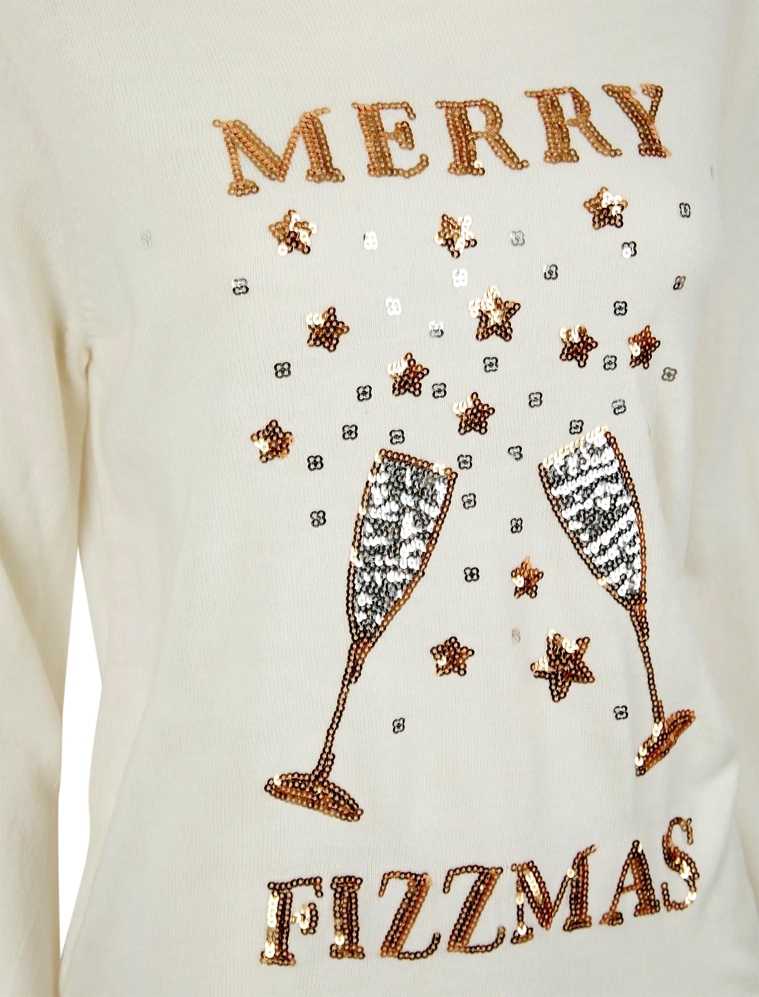 Get ready to celebrate the festive season in style with this women's 'Merry Fizzmas' sequin novelty knitted Christmas jumper in Gardenia by Merry Christmas. It's the perfect choice for all the Prosecco lovers out there, featuring a sparkling Prosecco glasses motif made from sequins, along with the text slogan ""Merry Fizzmas"" across the front.