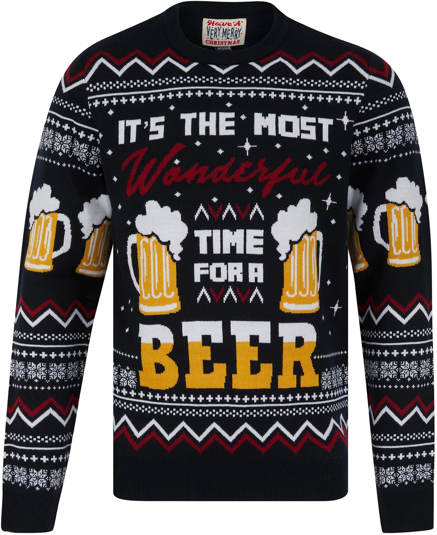 Showcasing the slogan ""The Most Wonderful Time For A Beer,"" this playful design is ideal for gatherings, pub nights, and family festivities, adding a cheerful touch to your look. Made from soft-touch acrylic knit jacquard, it offers cozy warmth and flexibility, with a classic crew neckline, long sleeves, and ribbed trims that ensure a comfortable fit and polished finish.