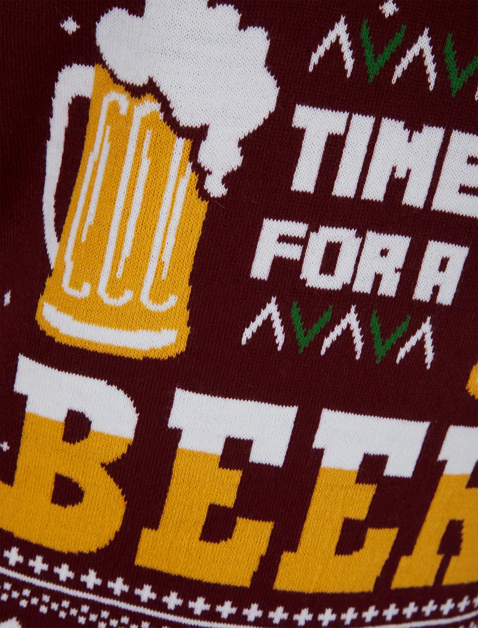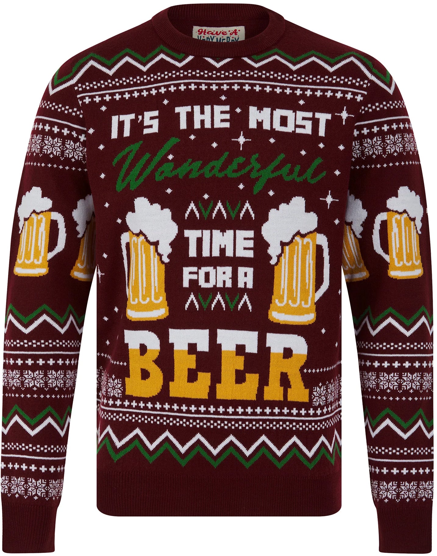 Showcasing the slogan ""The Most Wonderful Time For A Beer,"" this playful design is ideal for gatherings, pub nights, and family festivities, adding a cheerful touch to your look. Made from soft-touch acrylic knit jacquard, it offers cozy warmth and flexibility, with a classic crew neckline, long sleeves, and ribbed trims that ensure a comfortable fit and polished finish.