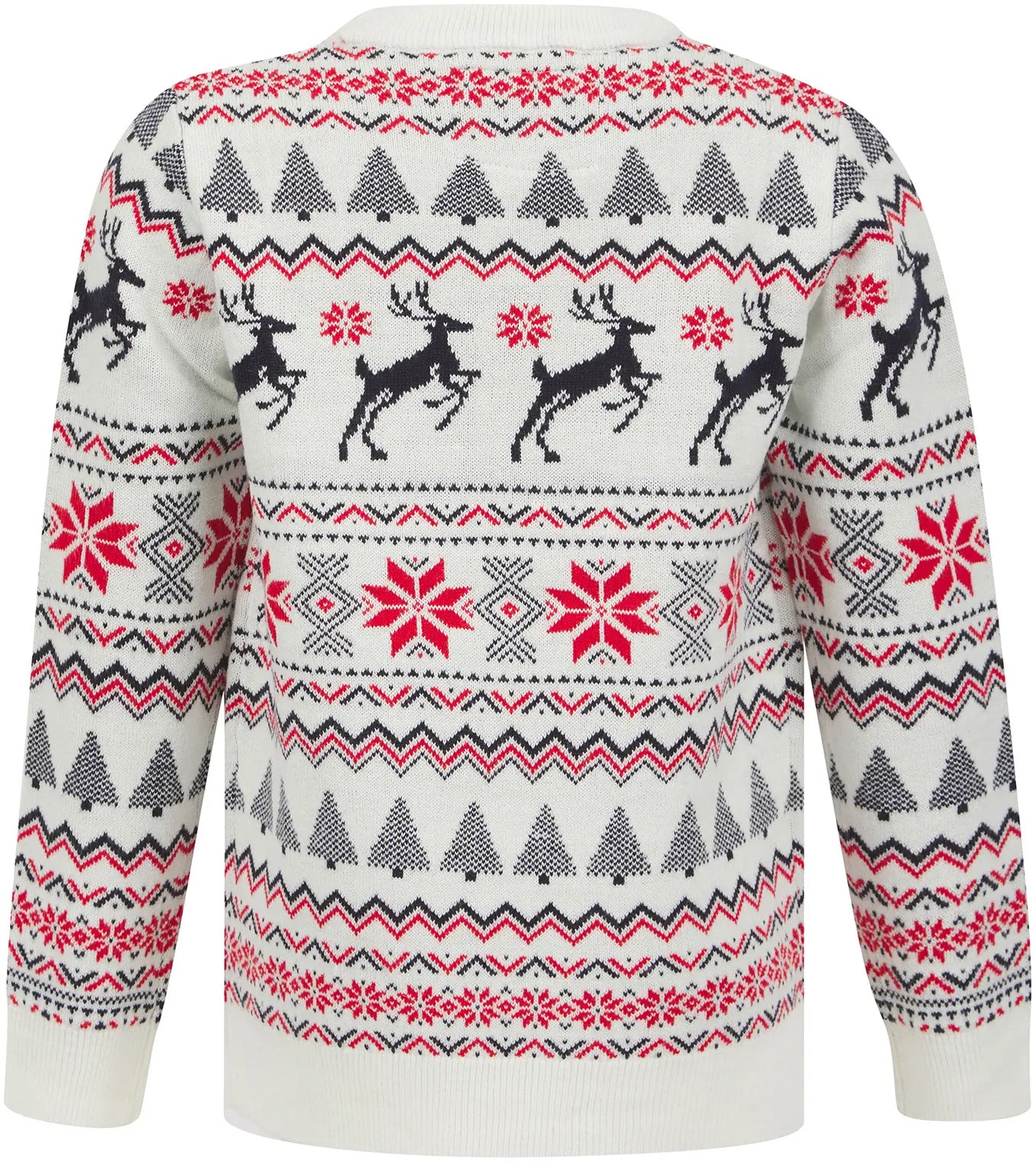 Make your child's festive season merrier with our Reindeer Christmas Jumper! Featuring a classic Fair Isle pattern adorned with prancing reindeer, snowflakes, and Christmas trees, this novelty sweater adds a touch of seasonal charm. Crafted from soft knit fabric, it ensures comfort and warmth for all-day wear. The crew neck design facilitates easy wear, making it ideal for Christmas parties, family dinners, and Christmas Jumper Day