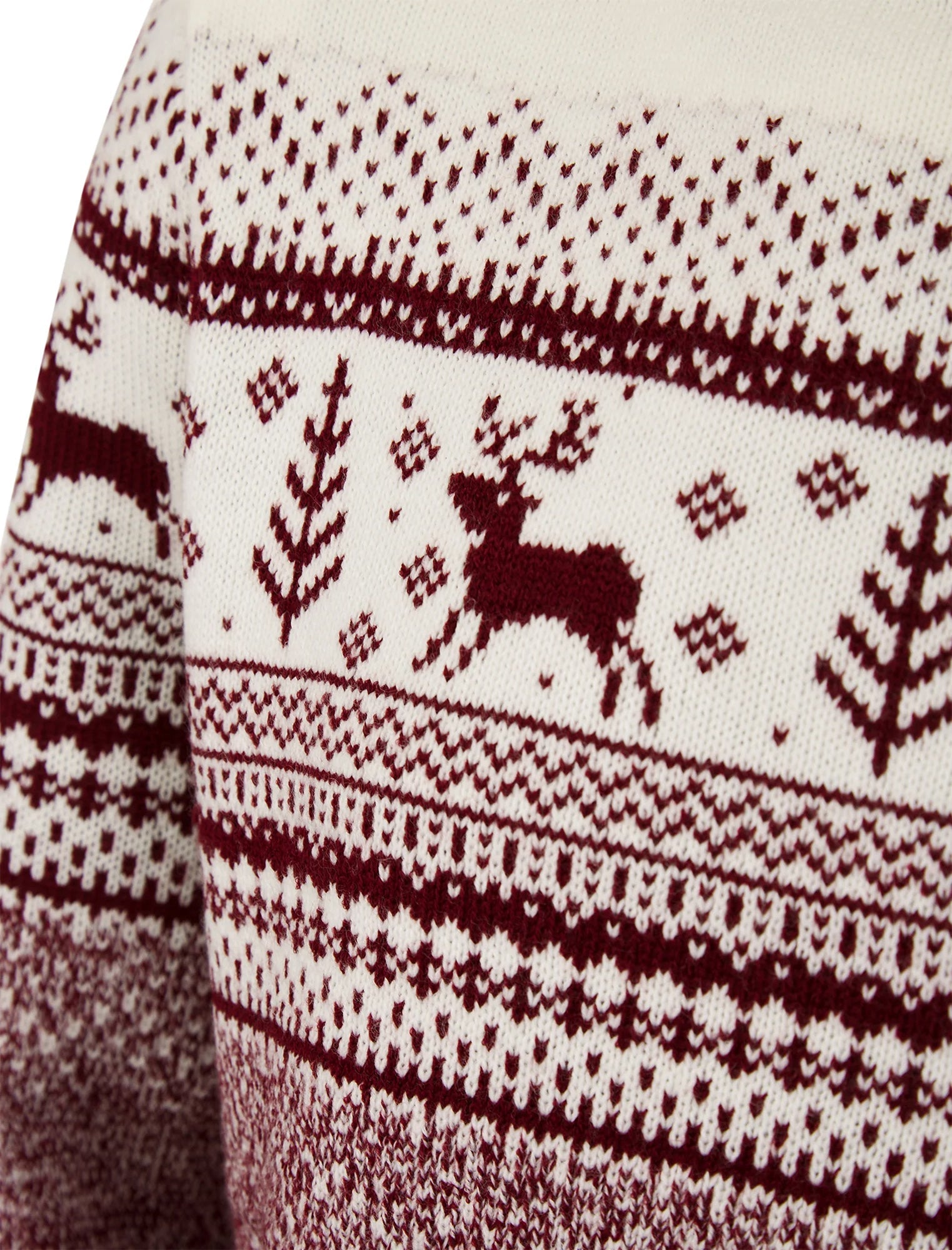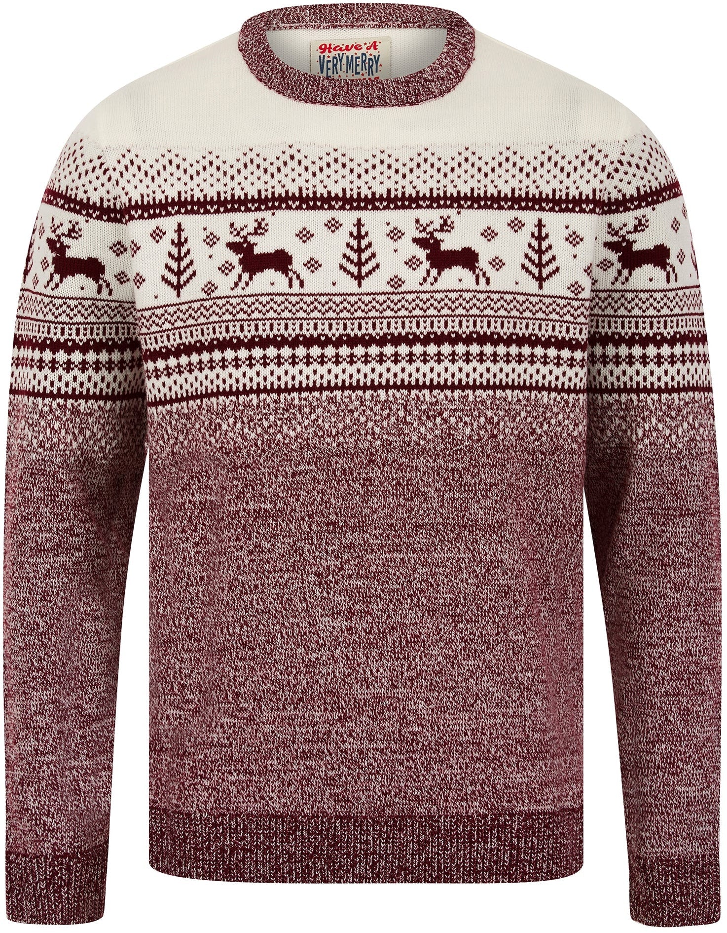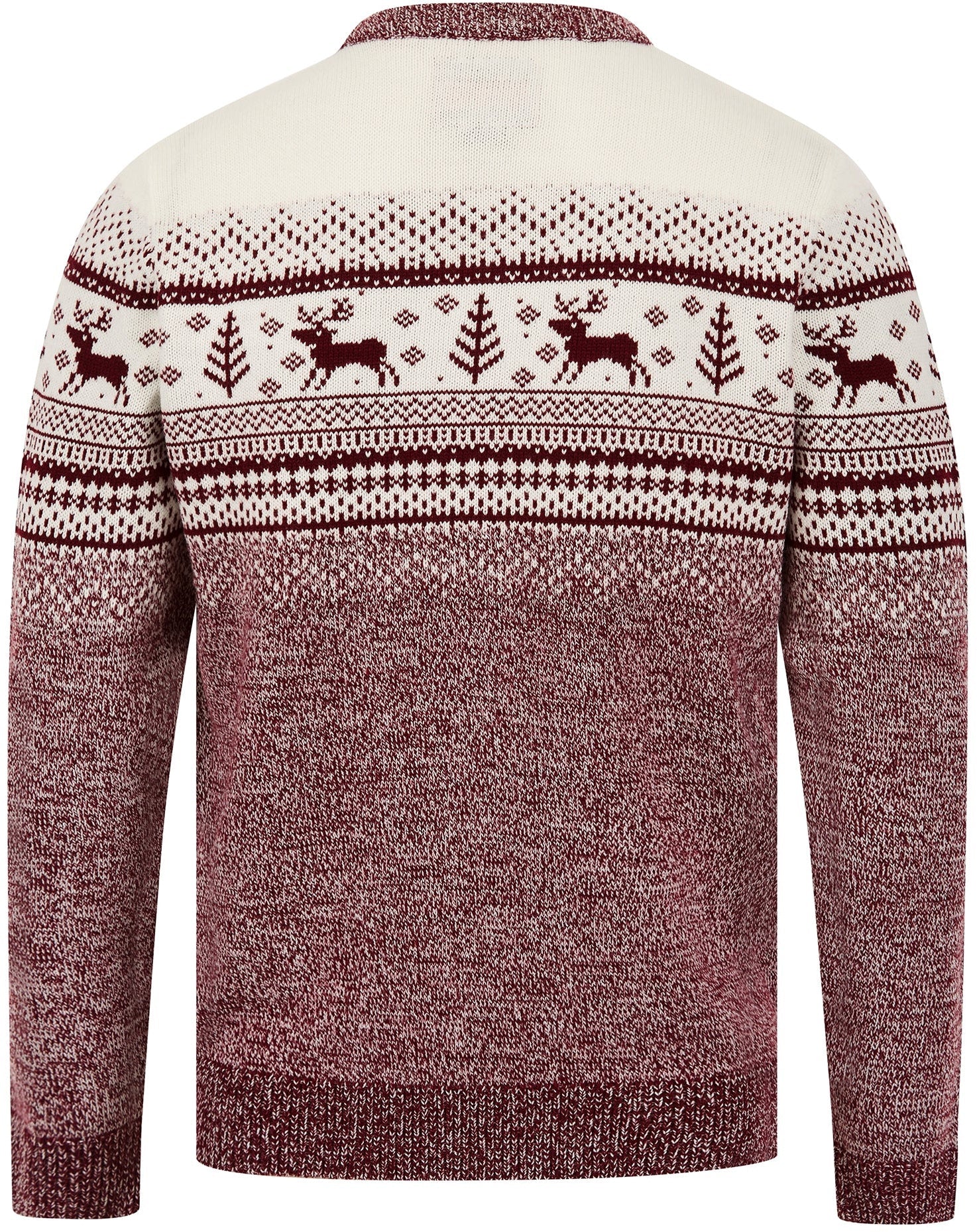 Elevate your winter wardrobe with the festive charm of the 'Rifkin' Jacquard Nordic/Fair Isle Style Christmas Jumper, featuring a delightful reindeer motif in claret twist by Merry Christmas. Perfect for both chilly days and seasonal celebrations, this jumper brings together style and comfort effortlessly.