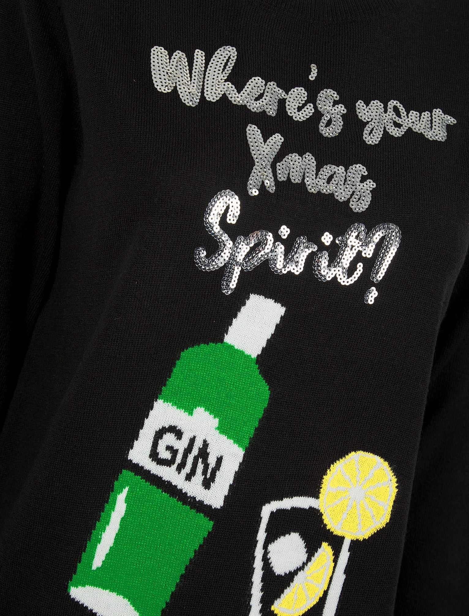 Get ready for the festive season with this women’s ‘Xmas Spirit’ sequin novelty knitted Christmas jumper in Jet Black. Perfect for all those Gin lovers out there; this pullover knit features a Jacquard knit Gin themed design with the sequinned text slogan “Where's You Xmas Spirit” across the front. This warm jumper has soft stretch with a classic crew neckline with long sleeves. Pair with jeans or a knitted skirt to keep it casual!