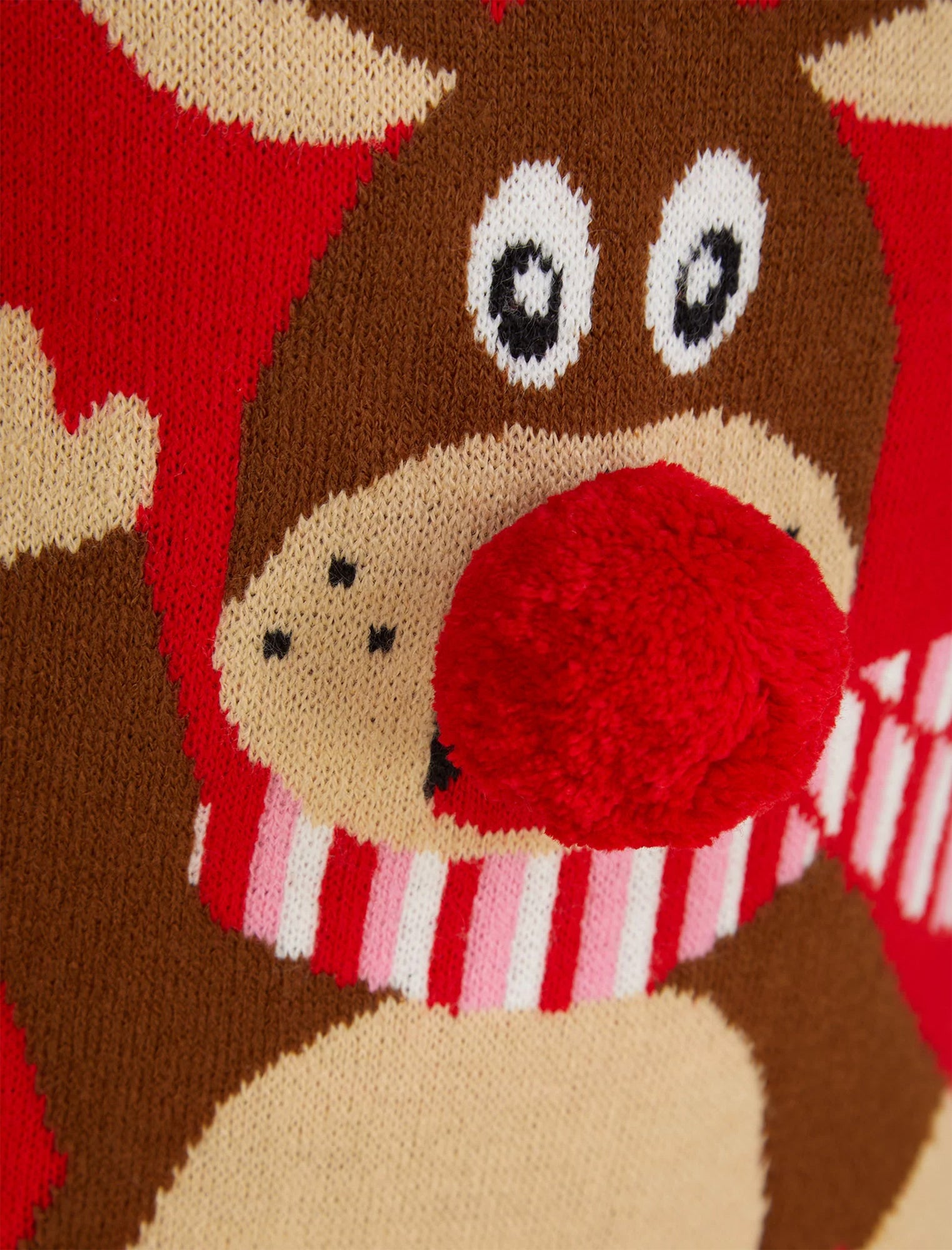 Keep it sweet with this adorable Girl’s ‘Waving Reindeer’ pom pom nose novelty Christmas jumper in tokyo red by Merry Christmas Kids (4-12yrs). She is going to love this festive knit with it’s cartoon reindeer jacquard motif on the front, complete with a stripy pink scarf and the 3D pomp pom nose for added texture! It’s styled with a classic crew neck line, full length sleeves and ribbed cuffs and hemline. This pullover is made in a soft, acrylic knit construction which ensures a comfortable fit. Simply add festive leggings and boots to finish off!