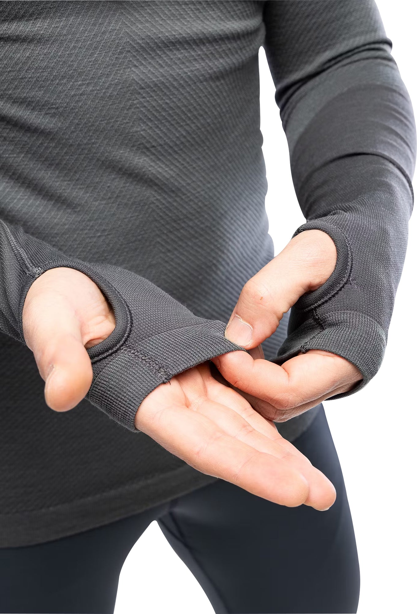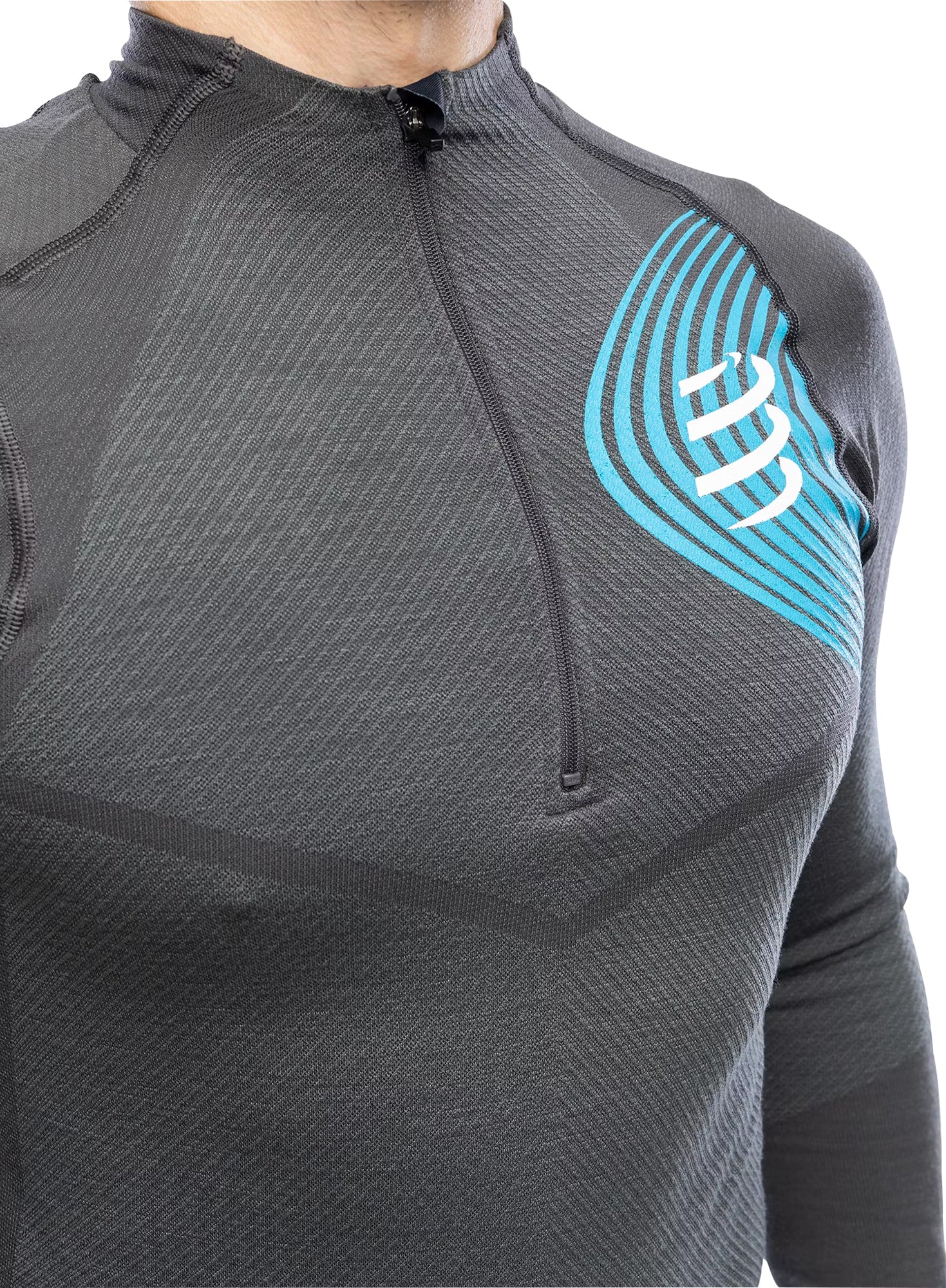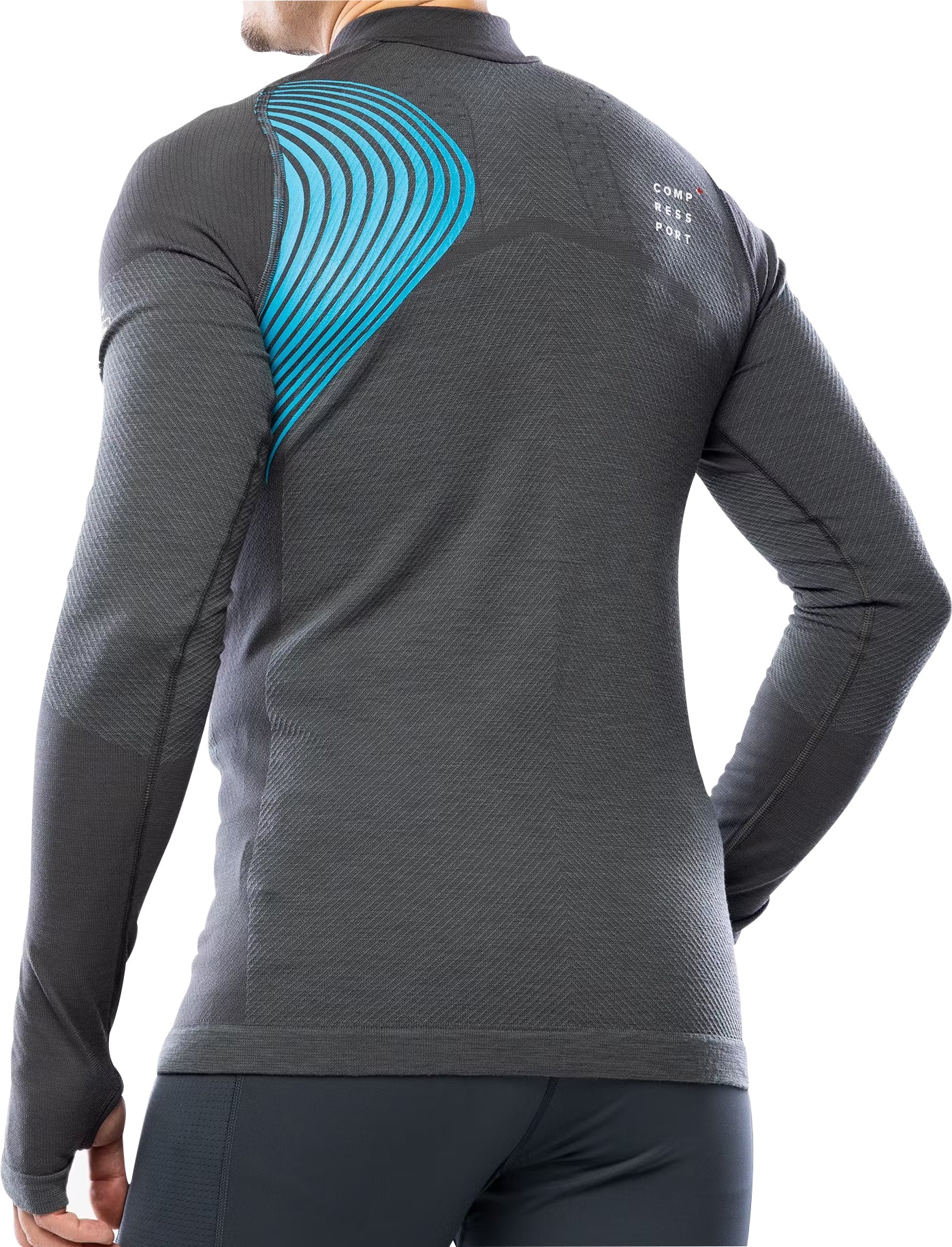 The Compressport Winter Trail Postural LS Top running sweatshirt uses breathable fabric with wool content, ensuring proper thermoregulation during training. Thanks to body-mapping technology, it effectively wicks moisture away from the fabric in areas most prone to sweating. The sweatshirt fits close to the body without restricting movement, making it an ideal choice for winter running workouts. The high collar and half-zip enhance ventilation, allowing for temperature regulation during activity. Thumbholes and a lightweight construction further enhance the functionality and comfort of the model.