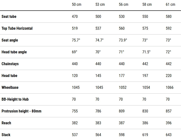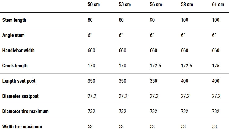 | Frame | Aluminium 6061 T6 Superlite, Gravel Comfort Geometry, Flat Mount Disc, Fender & Rack Option, QR |