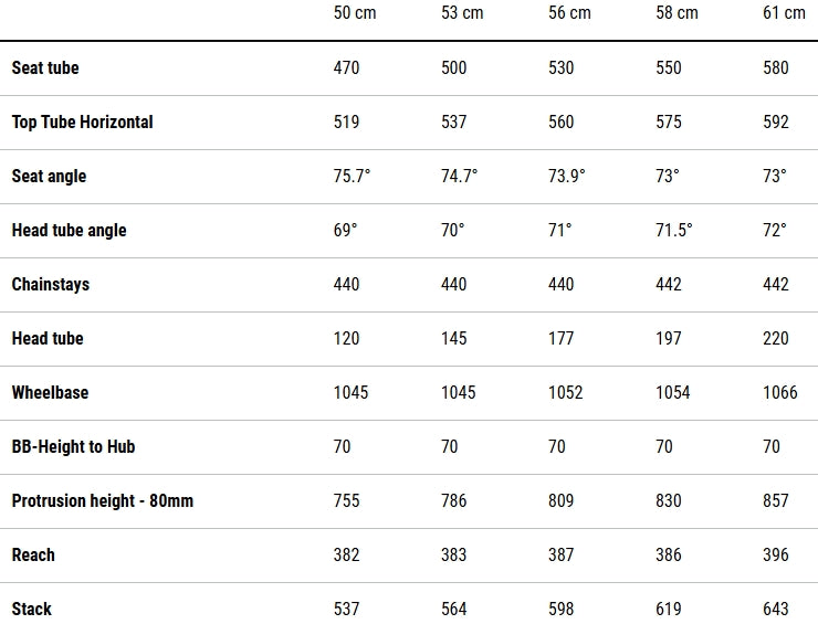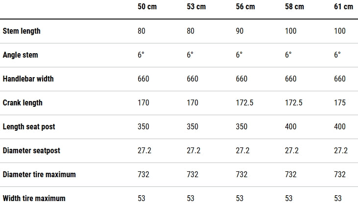 | Frame | Aluminium 6061 T6 Superlite, Gravel Comfort Geometry, Flat Mount Disc, Fender & Rack Option, QR |