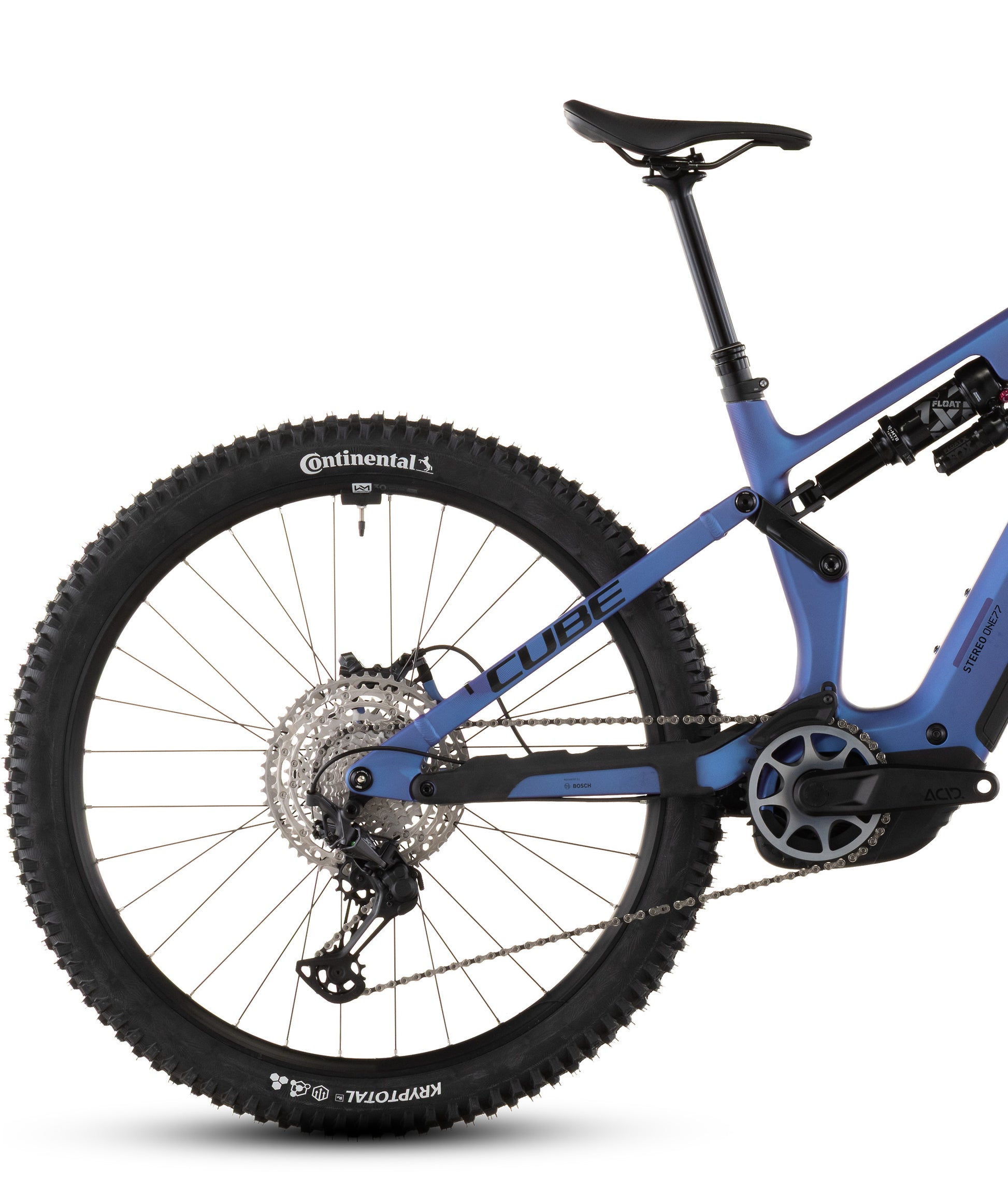 The Stereo Hybrid ONE77 HPC frame – with 170mm travel front and rear and a mullet wheel setup with 29in front and 27.5in rear – is all you need for big days out on big mountain trails. But, as with all CUBE designs, the devil is in the detail. So, for example, we added Integrated Cable Routing for super-clean looks, and then threw in an angle-adjustable headset so that you can tweak the handling to your taste. The 800Wh PowerTube battery sits unobtrusively in the carbon down tube, just above the Bosch CX drive. A UDH dropout on the aluminium rear triangle is tough and future-proof, and we also added a Direct Mount chain guide to keep you driving forwards even when the going gets rough.