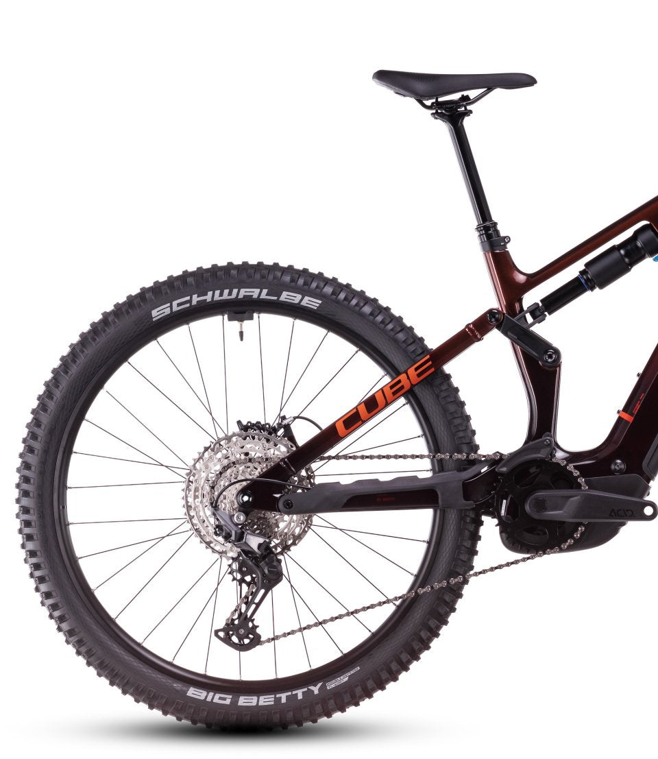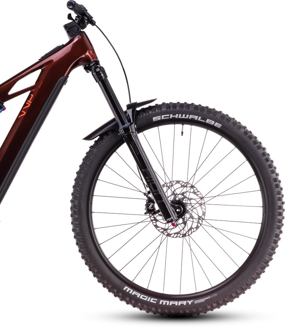 The Stereo Hybrid ONE77 HPC frame – with 170mm travel front and rear and a mullet wheel setup with 29in front and 27.5in rear – is all you need for big days out on big mountain trails. But, as with all CUBE designs, the devil is in the detail. So, for example, we added Integrated Cable Routing for super-clean looks and reduced maintenance, and then threw in an angle-adjustable headset so that you can tweak the handling to your taste. The 800 Wh PowerTube battery sits unobtrusively in the carbon down tube, just above the Bosch CX drive. A UDH dropout on the aluminium rear triangle is tough and future-proof, and we also added a direct mount chainguard to keep you driving forwards even when the going gets rough.