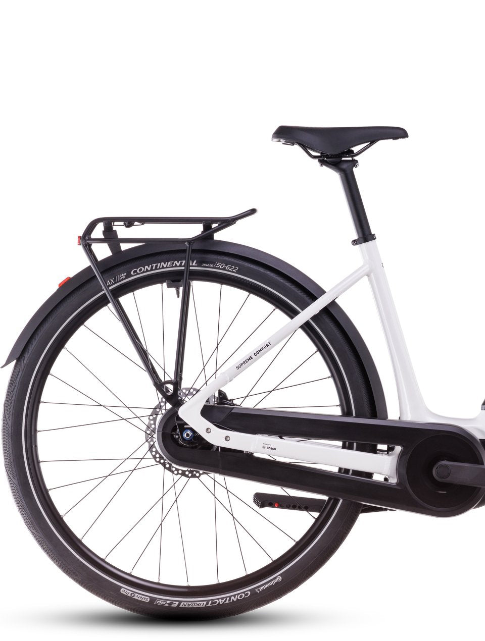 The Supreme Hybrid Comfort ONE 500 is the Bosch-powered e-bike that you never knew you needed, but will wonder how you ever managed without. From its elegant Easy Entry frame with semi-integrated luggage carrier to its carefully chosen components, it's designed so you can just get on and go. The Bosch Active Plus drive unit with smart system and 500Wh battery works seamlessly with Shimano's reliable, easy-to-use 8-speed hub gears to make light work of any journey. Powerful Shimano hydraulic disc brakes and Continental Contact Urban tyres help keep you safe in any weather. And we've included an integrated rear light, kickstand and an adjustable stem, too. It's got your name all over it.