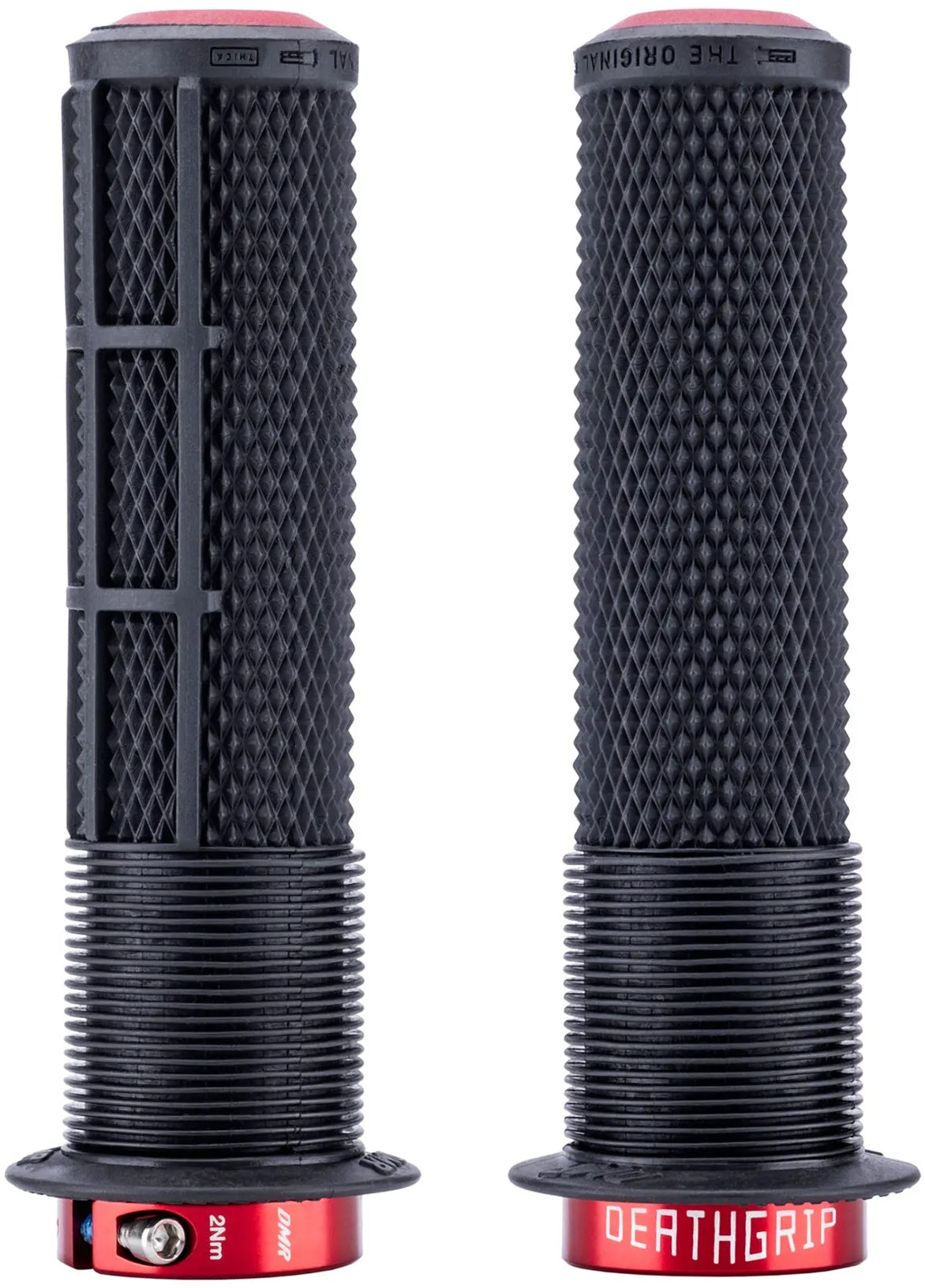 The DMR Deathgrip2 features the grip pattern and layout that inspired a whole generation of mountain bike grips – it starts with a soft mushroom section for comfort in the thumb and forefinger area, preventing blisters in a soft-tissue zone. Next, the grip pattern features diamond knurl for grip in all conditions and all terrains – and the waffle layout underside holds your fingers in the perfect position for grip and control. A tapered core means the Deathgrip is firmly mounted onto your handlebars with ease and the use of just one lockring keeps things simple and tight. The krayton rubber grip compounds we use are soft and comfortable, yet durable and lightweight. Select thin or thick diameters, and with or without flanges – the choice is yours.