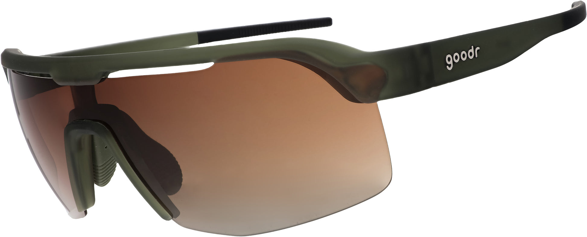 Green shield sunglasses w/ half-rim frames & amber gradient lenses shield you from light above while giving you better visibility of your feet. Won't slip or bounce while you deadlift fallen palm trees or wrassle a gorilla for the last coconut water.