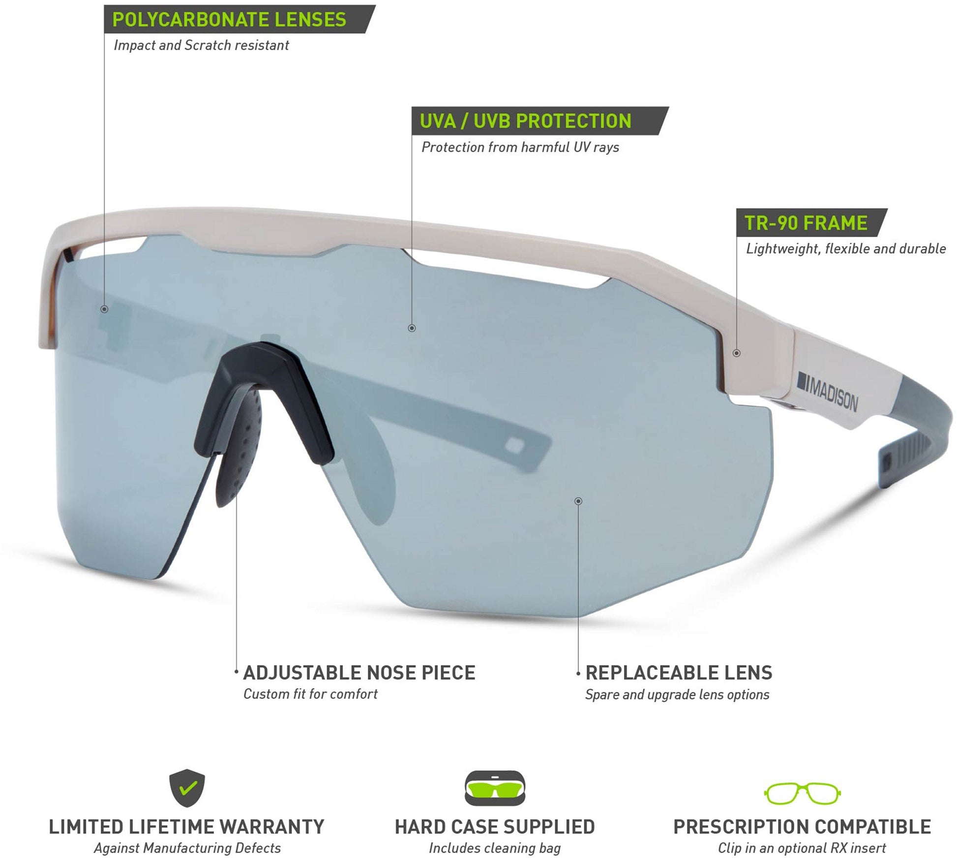 - Polycarbonate Lenses: Optics from Madison meets the highest standard for eyewear; ISO 12312. The interchangeable polycarbonate lenses are both impact and scratch-resistant. The lenses offer both supreme optical clarity and UV-A and UV-B protection