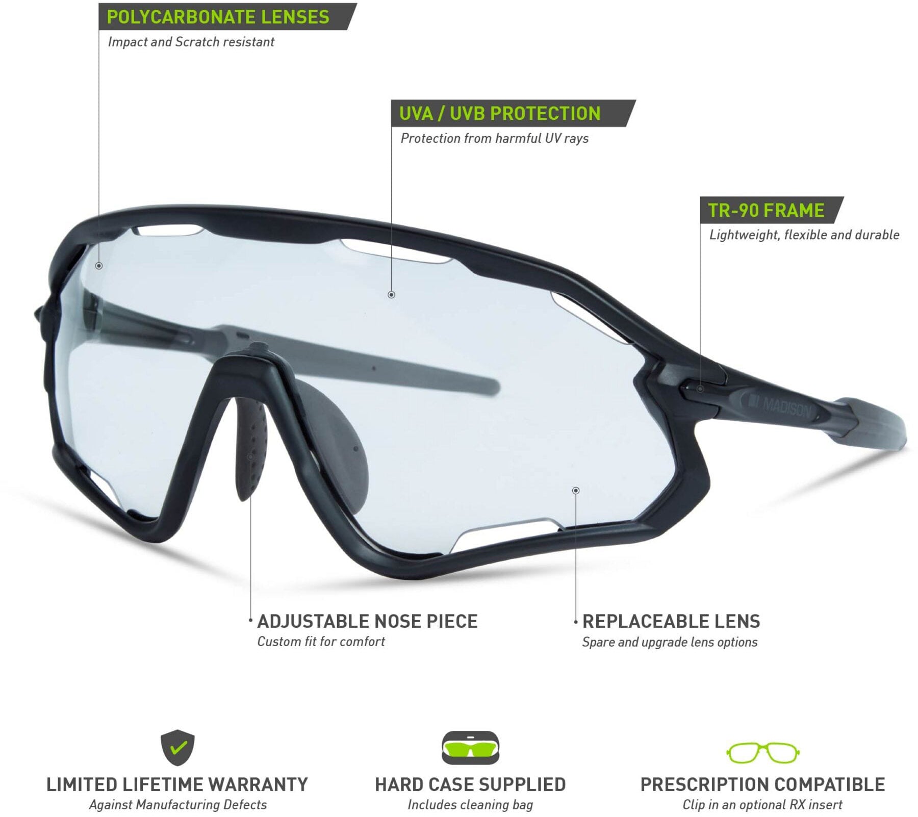 - Polycarbonate Lenses: Optics from Madison meets the highest standard for eyewear; ISO 12312. The interchangeable polycarbonate lenses are both impact and scratch-resistant. The lenses offer both supreme optical clarity and UV-A and UV-B protection