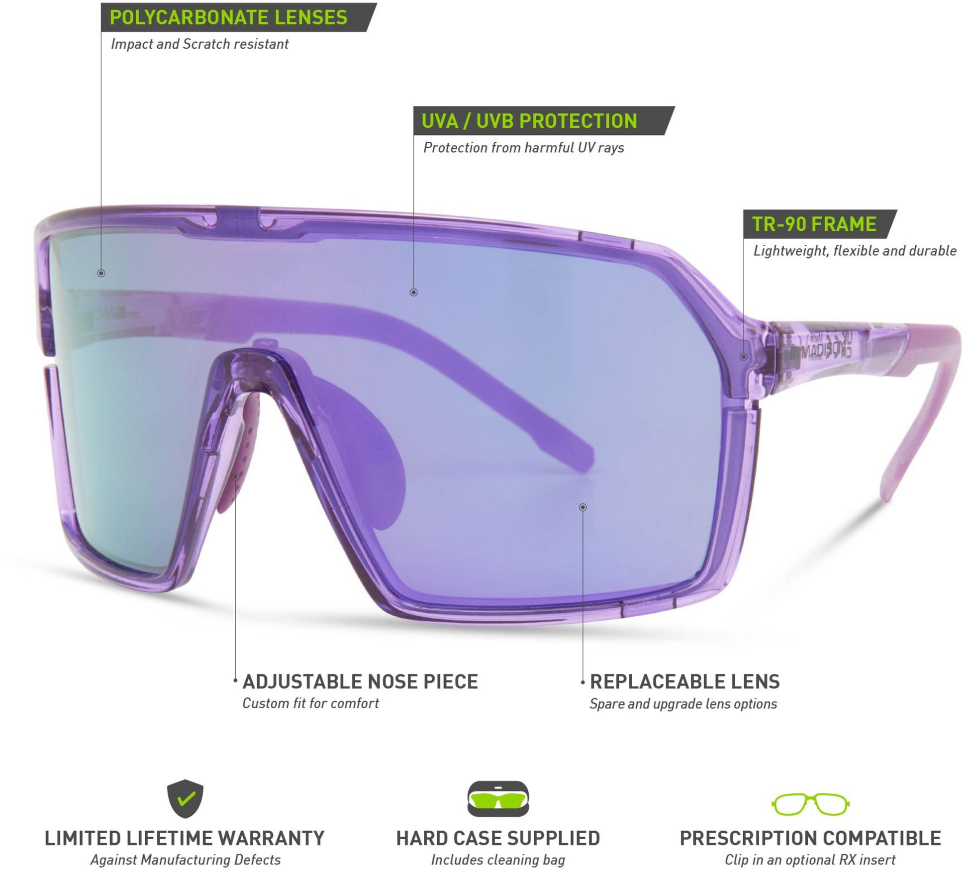 - Polycarbonate Lenses: Optics from Madison meets the highest standard for eyewear; ISO 12312. The interchangeable polycarbonate lenses are both impact and scratch-resistant. The lenses offer both supreme optical clarity and UV-A and UV-B protection