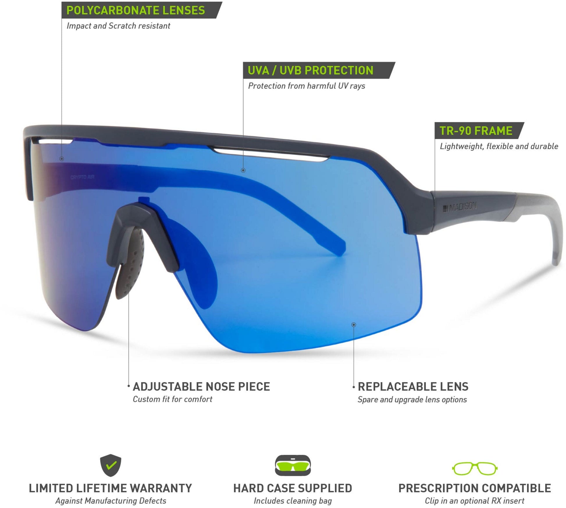 - Polycarbonate Lenses: Optics from Madison meets the highest standard for eyewear; ISO 12312. The interchangeable polycarbonate lenses are both impact and scratch-resistant. The lenses offer both supreme optical clarity and UV-A and UV-B protection