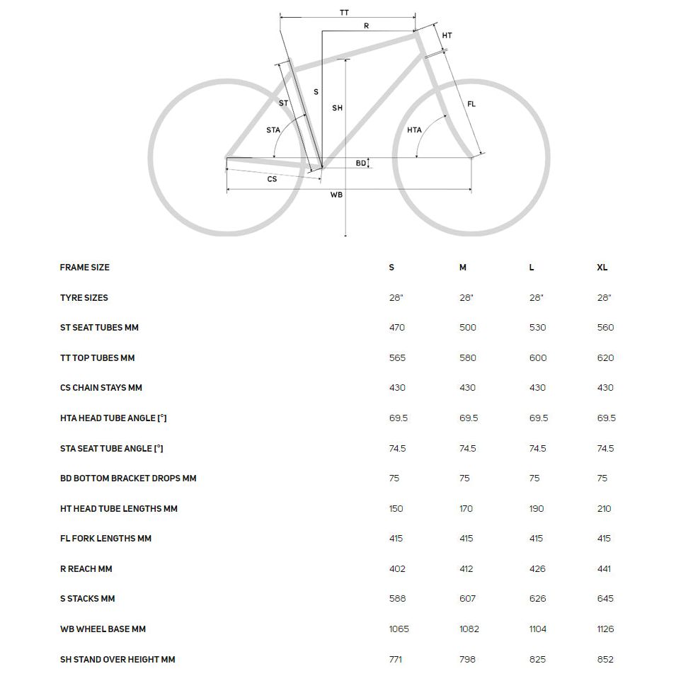 | Crankset | Shimano GRX600; 46-30 tooth chainset. Crank length: 170mm (XS,S), 172.5mm (M), 175mm (L,XL) |