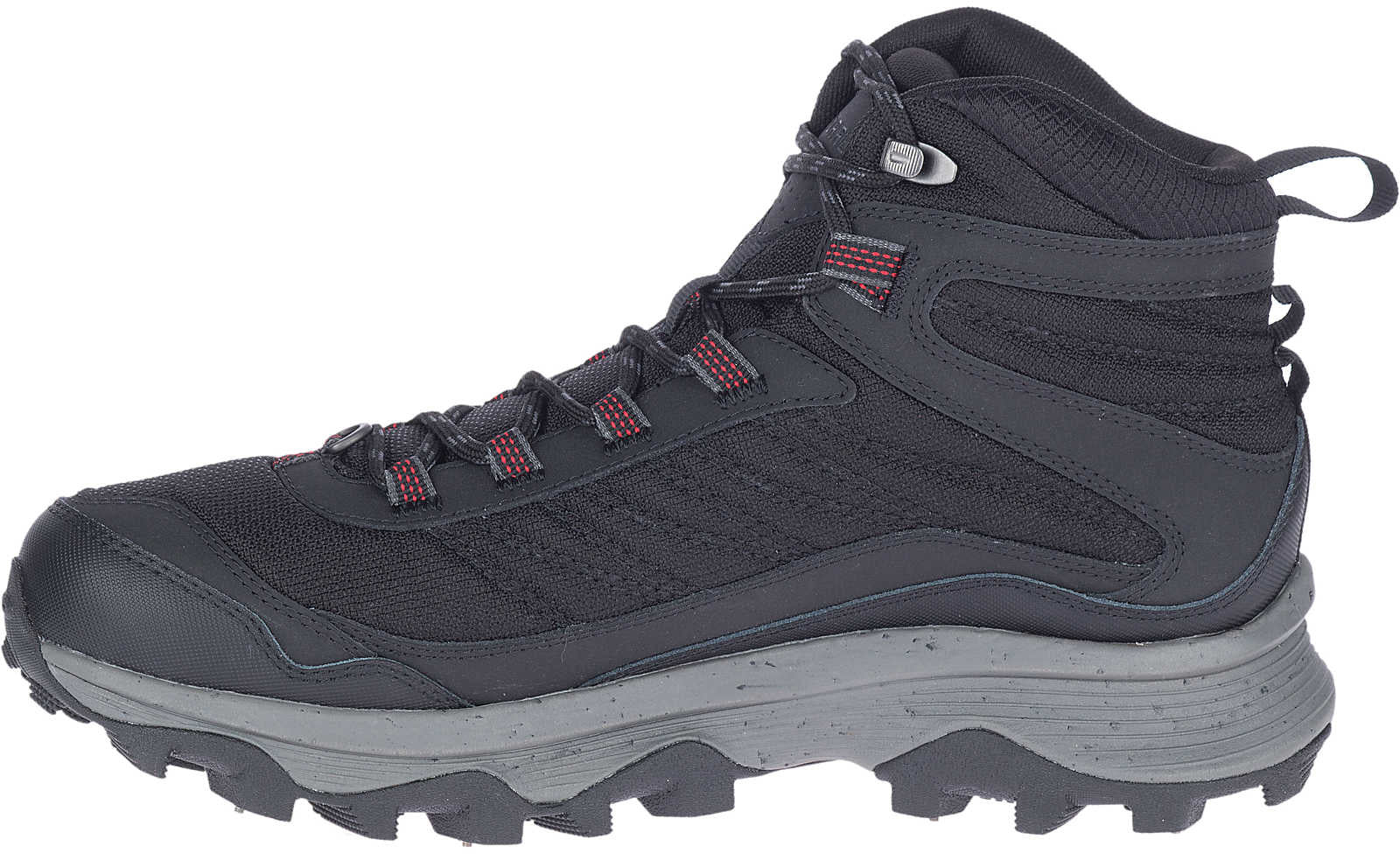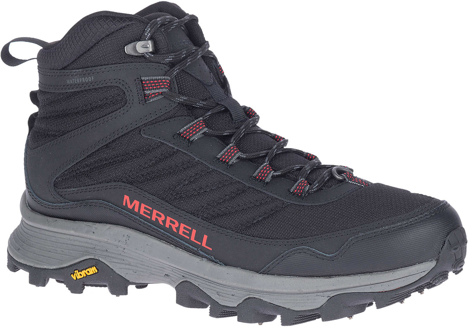 The Moab Speed Thermo Mid Waterproof Spike from Merrell is a waterproof and warm lined Mid boot. It has a wide last and Air Cushion cushioning for great comfort. The upper part is made of mesh and nylon with a waterproof membrane. The boot is warmly lined with 200 grams of insulation. The Vibram outsole with 10 carbide steel studs provides good stability and grip on slippery surfaces such as ice.