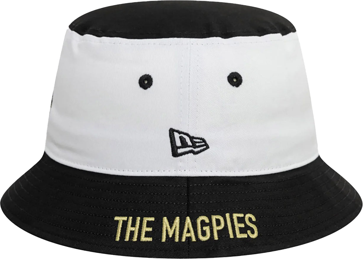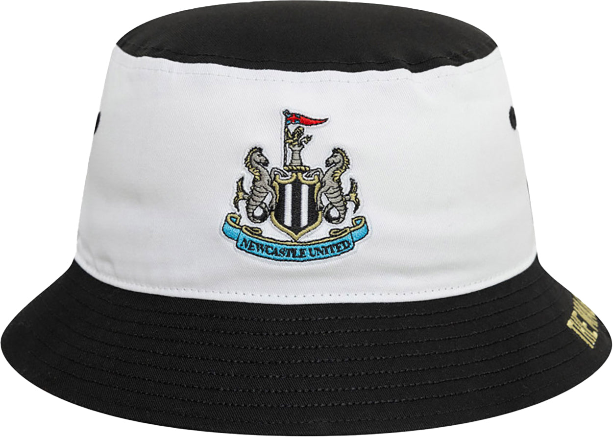This retro-style bucket hat showcases the iconic Newcastle United Club crest at the front, set against a white base with 'THE MAGPIES' printed in gold along the black visor, allowing you to display your support for Newcastle with flair.