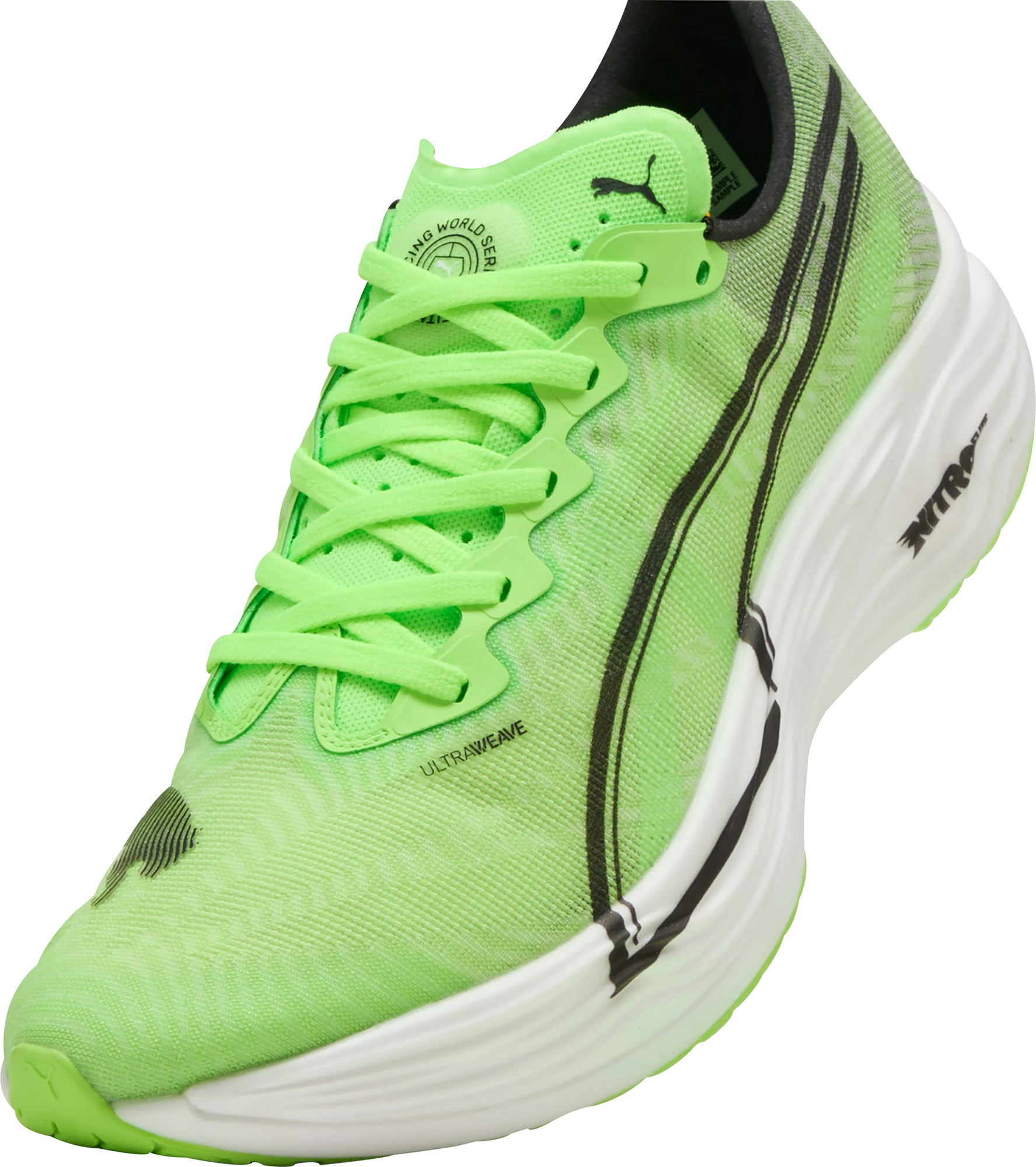Take your top speed to a level you never imagined with the PUMA Deviate Nitro Elite 3 HYROX. Worn by road racers and the world’s fastest HYROX athletes, it’s engineered and tested to be the ultimate race day shoe. It features NITROFOAM™ ELITE for best-in-class responsiveness and energy return, plus a stiff carbon fiber PWRPLATE for a powerfully responsive ride to make racing feel even more effortless. This pair also features a unique, mismatched design with one shoe in white and the other in green.