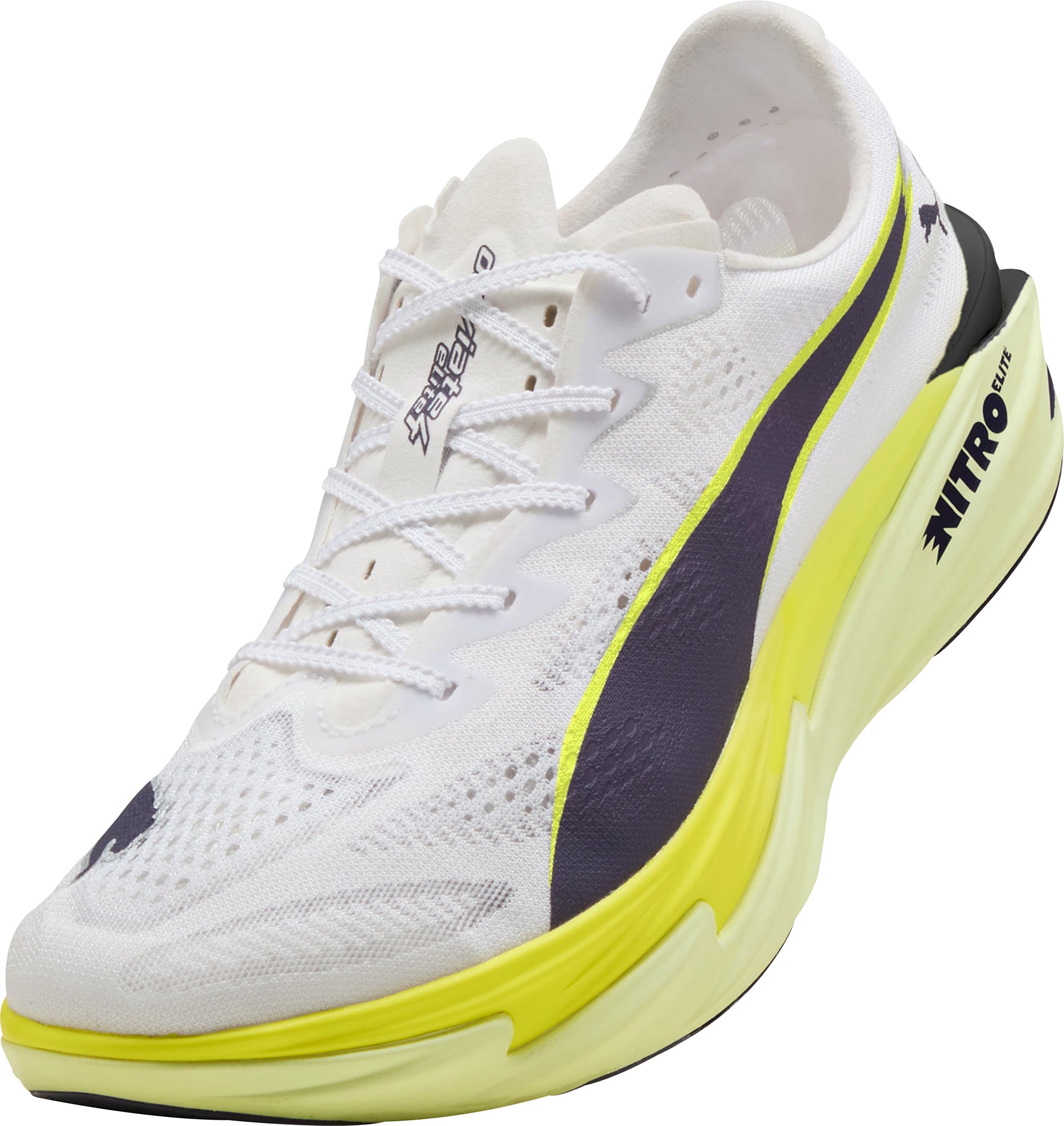 Hit turbo speed. The DEVIATE NITRO ELITE 4 is a running shoe redesigned for lightweight, race day propulsion. A carbon fiber PWRPLATE ensures stability and maximum running efficiency, while NITROFOAM ELITE offers supreme cushioning that won’t weigh you down. It’s a running go-to made with lightweight monomesh and durable PUMAGRIP rubber for multi-surface traction and an effortless run.