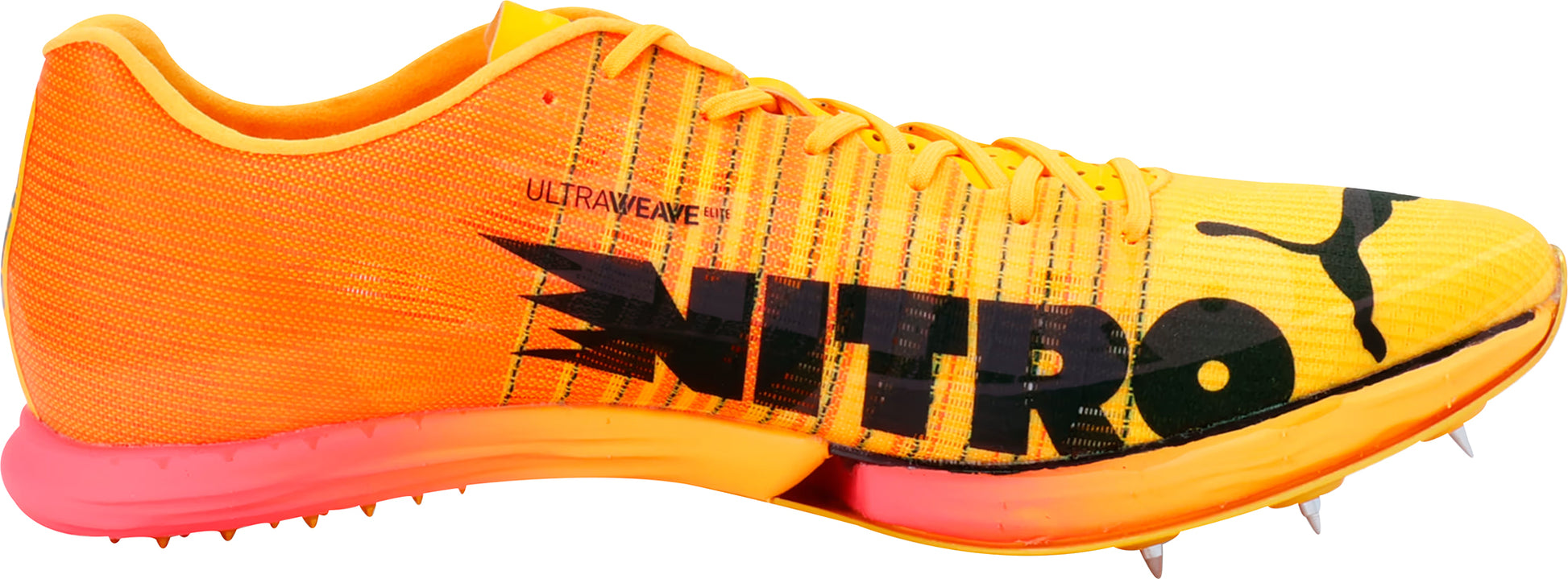 Maximum propulsion, maximum responsiveness, and maximum speed – that's what we've engineered in this evoSPEED Forte NITRO Elite track spike. Built for sprinting events of 400m and under, the racing shoe features a lightweight ULTRAWEAVE Elite upper infused with carbon fiber threads for a secure fit. Full-length layers of our NITRO Elite foam combine with our carbon fiber PWRPLATE to deliver power and propulsion from the starting blocks. Providing an extra boost is the Pebax outsole spike plate – featuring eight removable spike pin receptacles – and a special heel pad for superior grip, helping you maintain the high turnover needed to win your race.