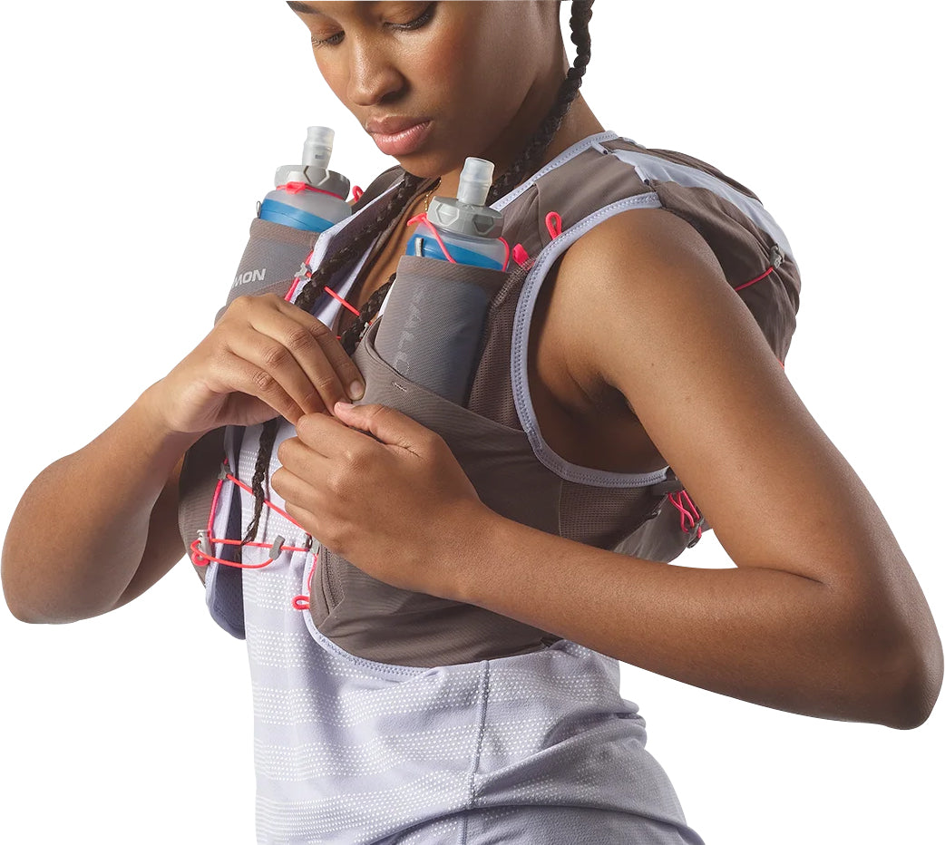 - 2 front flask pockets - Designed to fit Salomon soft flasks, these front pockets limit bouncing. Top elastic loops secure your flasks and keep them ready to drink.