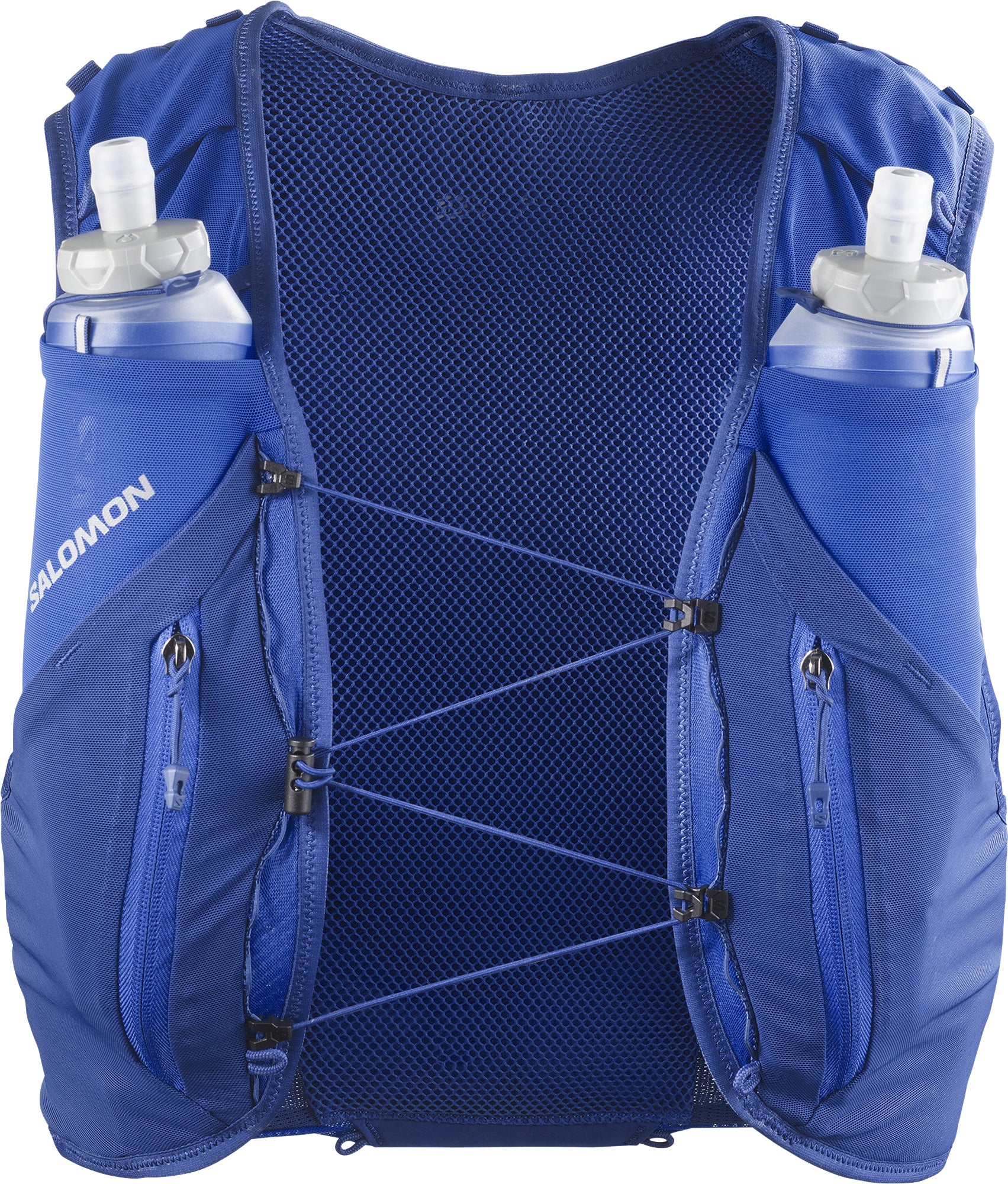 - 2 front flask pockets - Designed to fit Salomon soft flasks, these front pockets limit bouncing. Top elastic loops secure your flasks and keep them ready to drink.