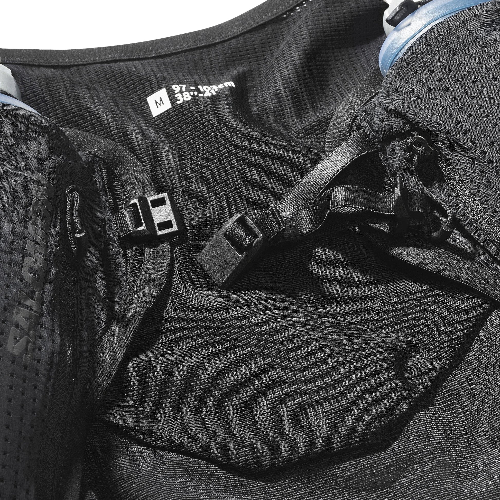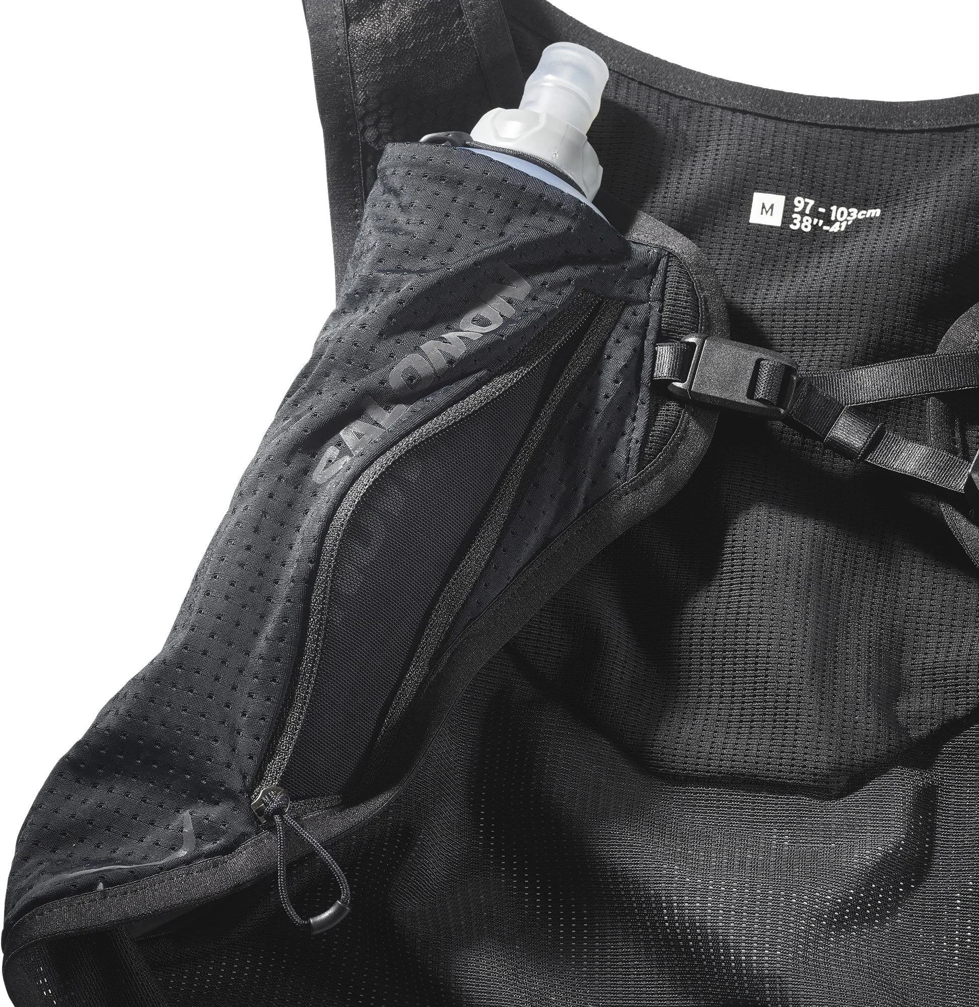 - 2 front flask pockets - Designed to fit Salomon soft flasks, these front pockets limit bouncing. Top elastic loops secure your flasks and keep them ready to drink.